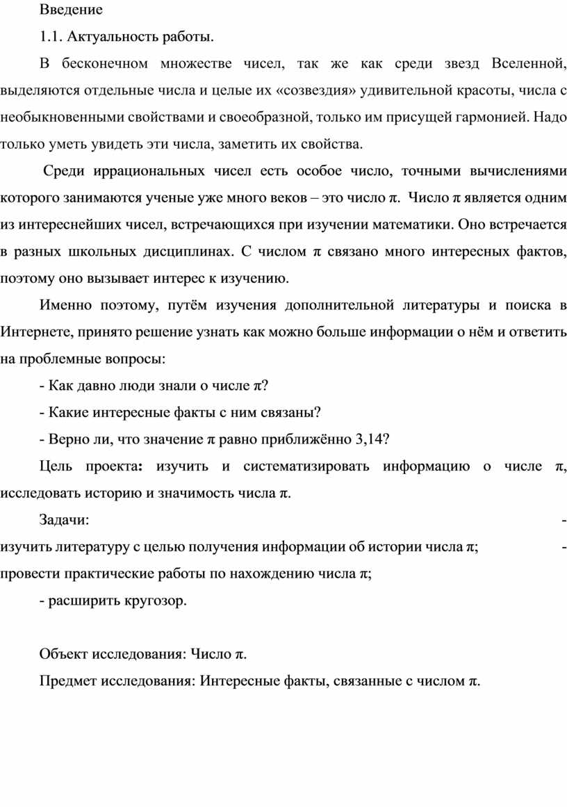 Среди иррациональных чисел есть особое число, точными вычислениями которого занимаются ученые уже много веков – это число π. Число π является одним из интереснейших чисел, встречающихся при изучении математики. Оно встречается в разных школьных дисциплинах. С числом π связано много интересных фактов, поэтому оно вызывает интерес к изучению.
