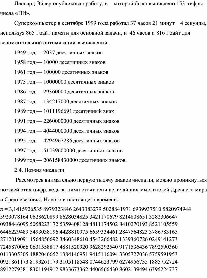 Рассмотрев внимательно первую тысячу знаков числа пи, можно проникнуться поэзией этих цифр, ведь за ними стоят тени величайших мыслителей Древнего мира и Средневековья, Нового и настоящего времени.