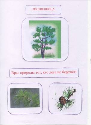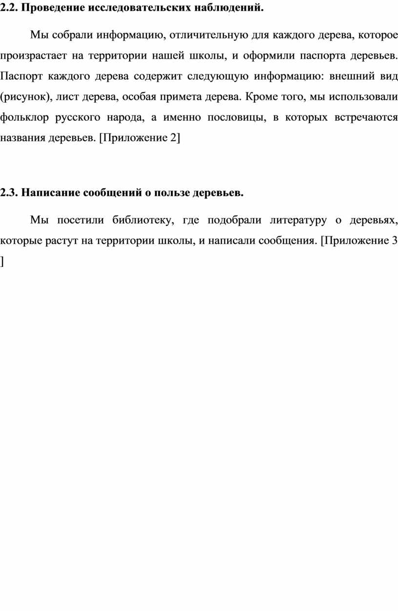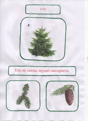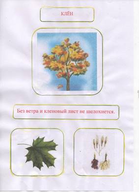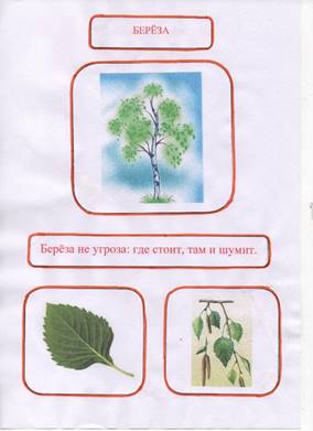 Мы собрали информацию, отличительную для каждого дерева, которое произрастает на территории нашей школы, и оформили паспорта деревьев. Паспорт каждого дерева содержит следующую информацию: внешний вид (рисунок), лист дерева, особая примета дерева. Кроме того, мы использовали фольклор русского народа, а именно пословицы, в которых встречаются названия деревьев. [Приложение 2]