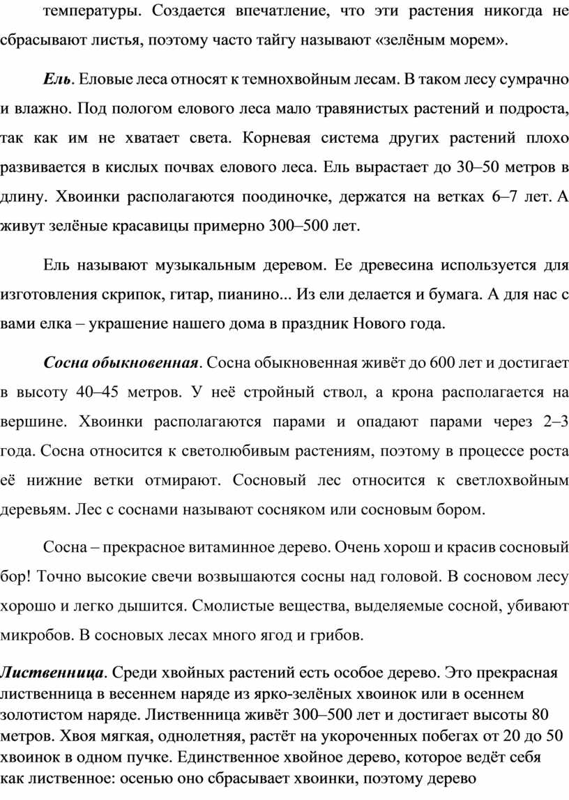 Ель. Еловые леса относят к темнохвойным лесам. В таком лесу сумрачно и влажно. Под пологом елового леса мало травянистых растений и подроста, так как им не хватает света. Корневая система других растений плохо развивается в кислых почвах елового леса. Ель вырастает до 30–50 метров в длину. Хвоинки располагаются поодиночке, держатся на ветках 6–7 лет. А живут зелёные красавицы примерно 300–500 лет.