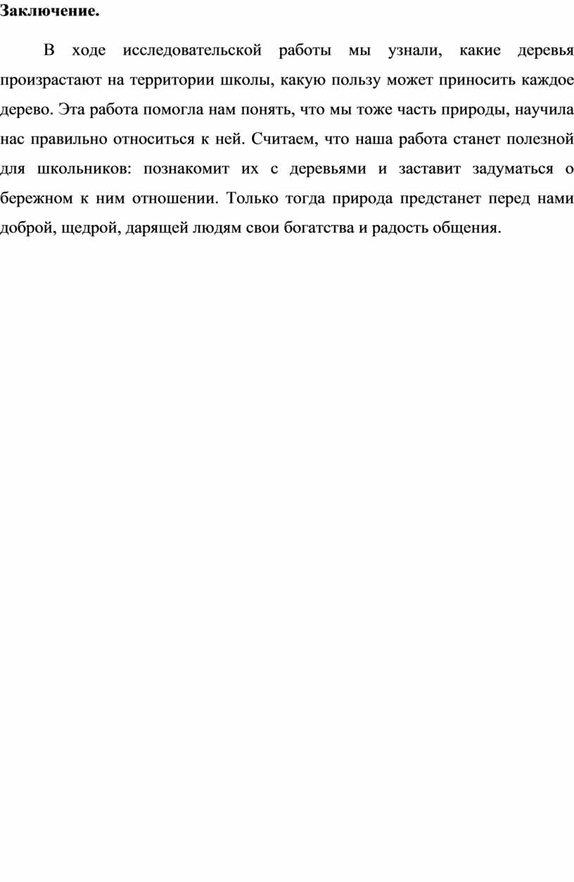 В ходе исследовательской работы мы узнали, какие деревья произрастают на территории школы, какую пользу может приносить каждое дерево. Эта работа помогла нам понять, что мы тоже часть природы, научила нас правильно относиться к ней. Считаем, что наша работа станет полезной для школьников: познакомит их с деревьями и заставит задуматься о бережном к ним отношении. Только тогда природа предстанет перед нами доброй, щедрой, дарящей людям свои богатства и радость общения.