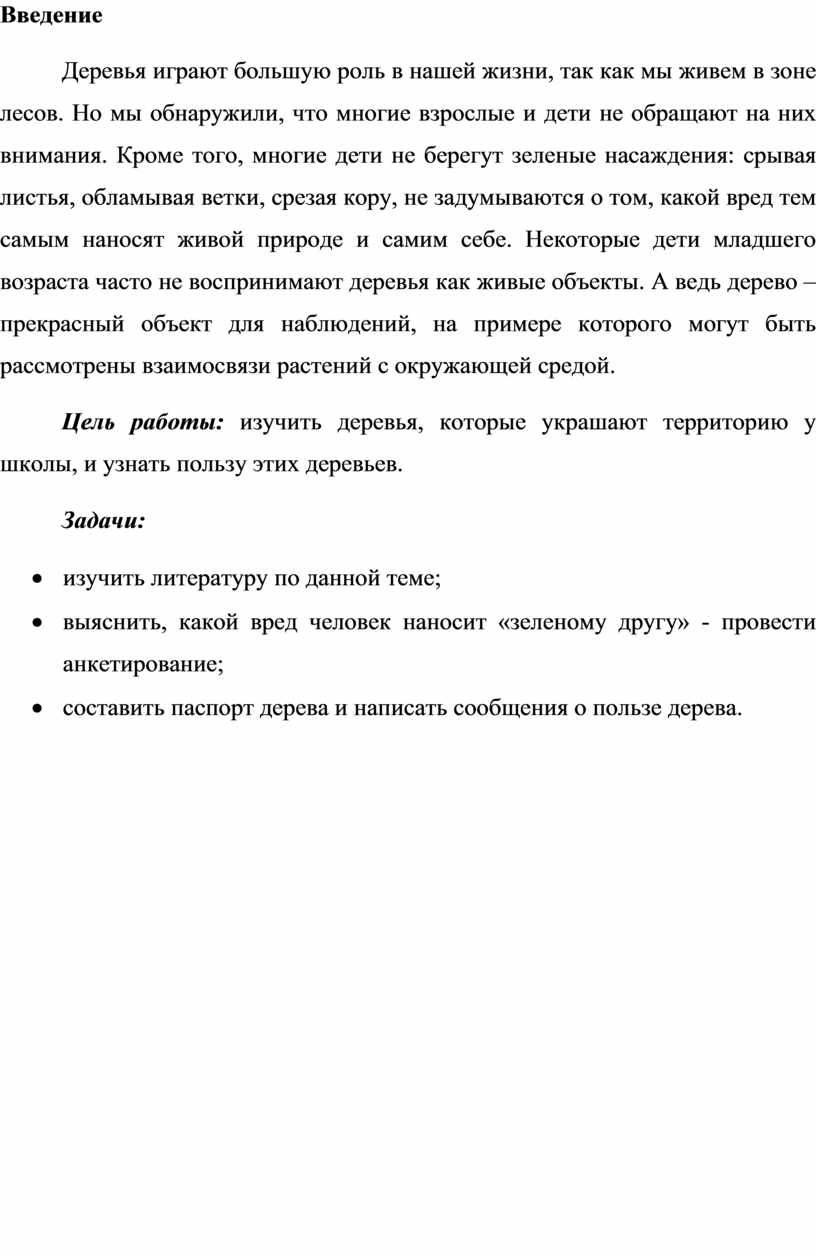 Деревья играют большую роль в нашей жизни, так как мы живем в зоне лесов. Но мы обнаружили, что многие взрослые и дети не обращают на них внимания. Кроме того, многие дети не берегут зеленые насаждения: срывая листья, обламывая ветки, срезая кору, не задумываются о том, какой вред тем самым наносят живой природе и самим себе. Некоторые дети младшего возраста часто не воспринимают деревья как живые объекты. А ведь дерево – прекрасный объект для наблюдений, на примере которого могут быть рассмотрены взаимосвязи растений с окружающей средой.