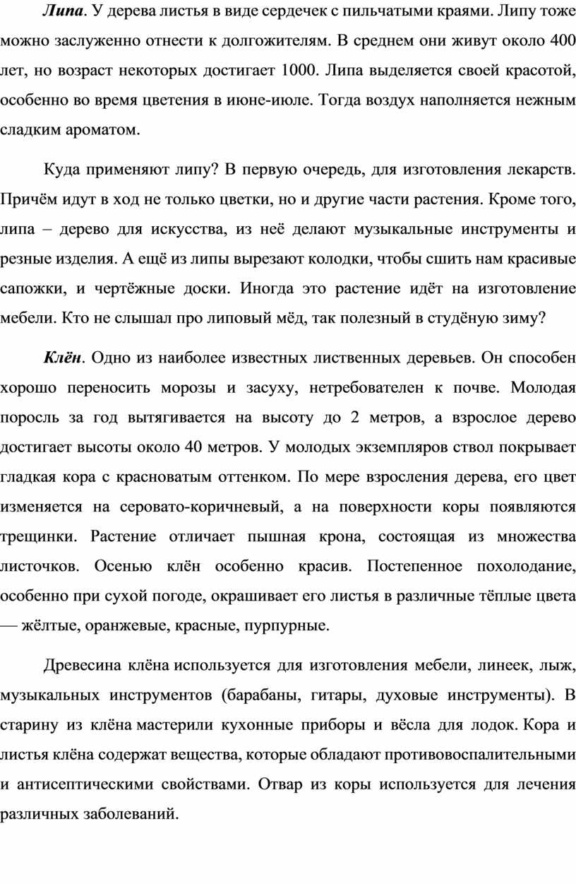 Липа. У дерева листья в виде сердечек с пильчатыми краями. Липу тоже можно заслуженно отнести к долгожителям. В среднем они живут около 400 лет, но возраст некоторых достигает 1000. Липа выделяется своей красотой, особенно во время цветения в июне-июле. Тогда воздух наполняется нежным сладким ароматом.