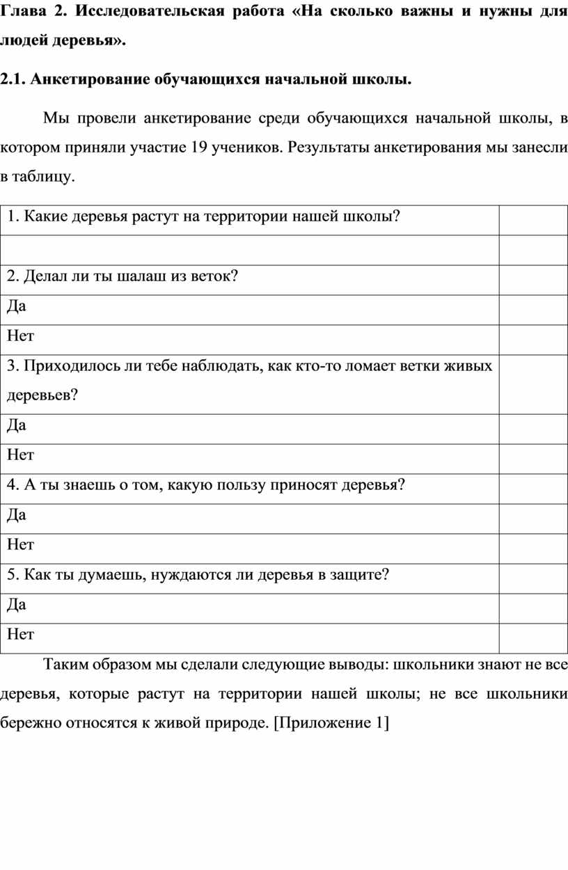 Глава 2. Исследовательская работа «На сколько важны и нужны для людей деревья».