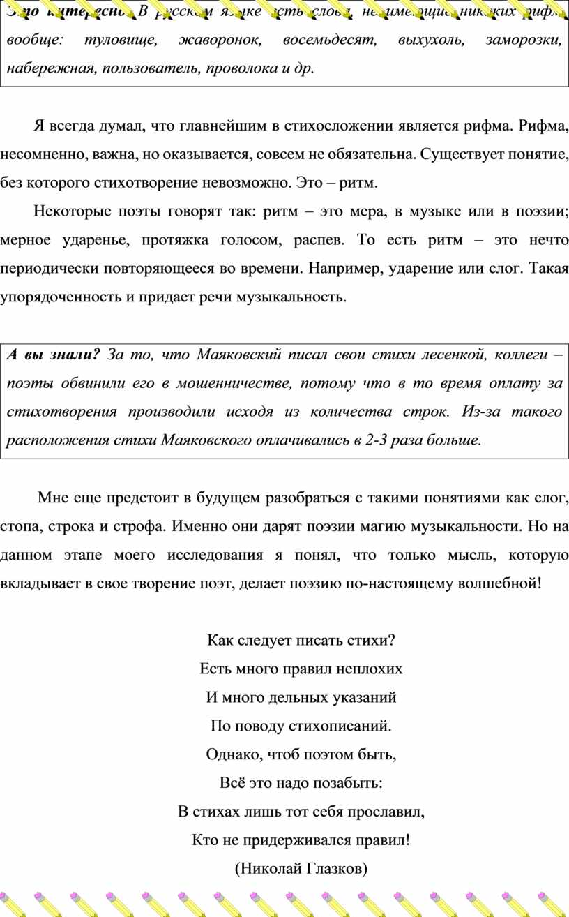 Первый этап – теоретический. Я изучил литературу и расспросил дедушку, какие существуют правила стихосложения. Собирал информацию, рассуждал. И что же я узнал?
