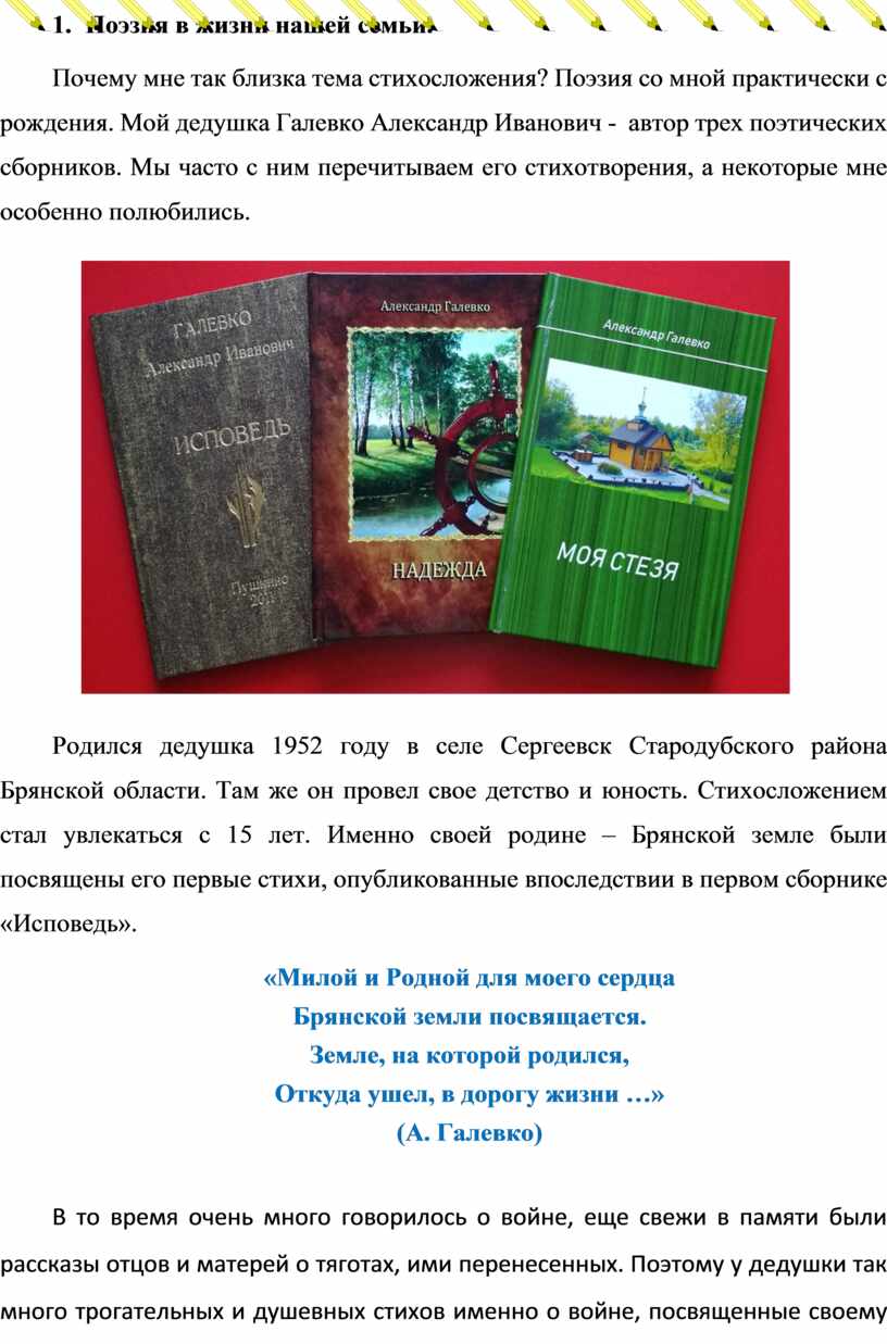 Почему мне так близка тема стихосложения? Поэзия со мной практически с рождения. Мой дедушка Галевко Александр Иванович - автор трех поэтических сборников. Мы часто с ним перечитываем его стихотворения, а некоторые мне особенно полюбились.