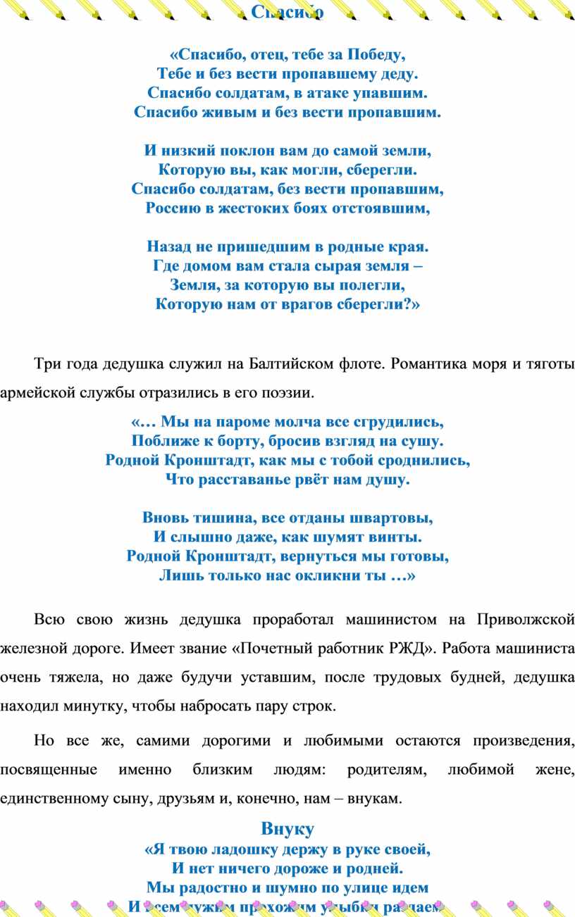 Всю свою жизнь дедушка проработал машинистом на Приволжской железной дороге. Имеет звание «Почетный работник РЖД». Работа машиниста очень тяжела, но даже будучи уставшим, после трудовых будней, дедушка находил минутку, чтобы набросать пару строк.