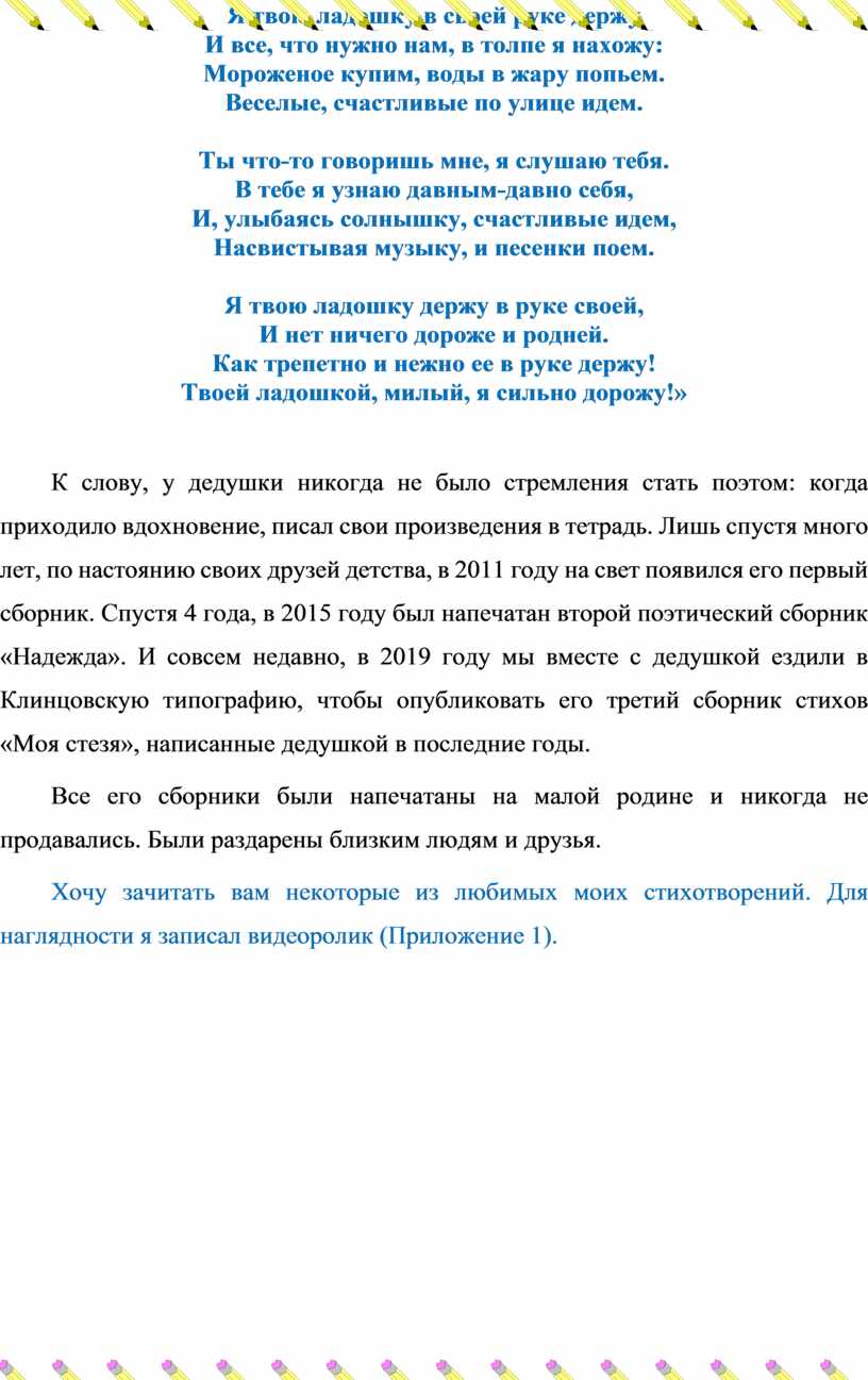 К слову, у дедушки никогда не было стремления стать поэтом: когда приходило вдохновение, писал свои произведения в тетрадь. Лишь спустя много лет, по настоянию своих друзей детства, в 2011 году на свет появился его первый сборник. Спустя 4 года, в 2015 году был напечатан второй поэтический сборник «Надежда». И совсем недавно, в 2019 году мы вместе с дедушкой ездили в Клинцовскую типографию, чтобы опубликовать его третий сборник стихов «Моя стезя», написанные дедушкой в последние годы.