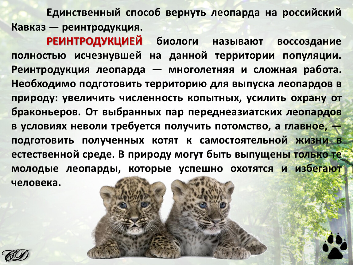 РЕИНТРОДУКЦИЕЙ биологи называют воссоздание полностью исчезнувшей на данной территории популяции. Реинтродукция леопарда — многолетняя и сложная работа. Необходимо подготовить территорию для выпуска леопардов в природу: увеличить численность копытных, усилить охрану от браконьеров. От выбранных пар переднеазиатских леопардов в условиях неволи требуется получить потомство, а главное, — подготовить полученных котят к самостоятельной жизни в естественной среде. В природу могут быть выпущены только те молодые леопарды, которые успешно охотятся и избегают человека.