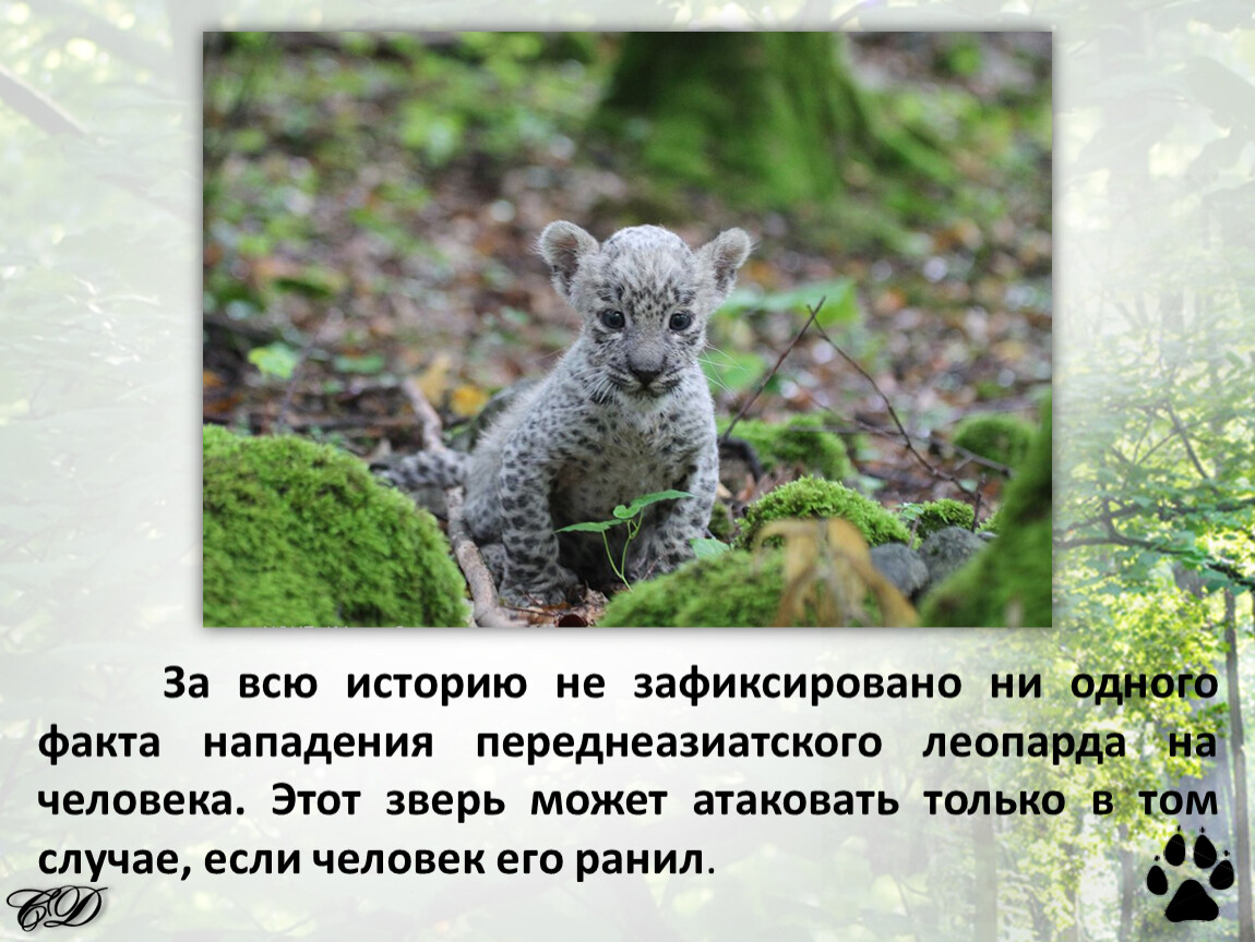 Анализ обширной литературы и многочисленные беседы с очевидцами, встречавшими диких леопардов на Кавказе показал, что за прошедшие 120 лет нападений этой кошки на человека не отмечено.