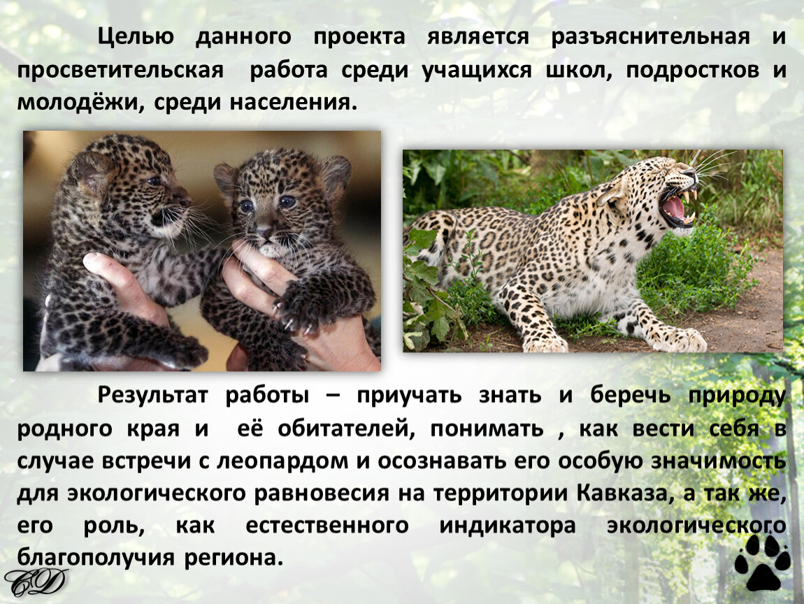 Результат работы – приучать знать и беречь природу родного края и её обитателей, понимать , как вести себя в случае встречи с леопардом и осознавать его особую значимость для экологического равновесия на территории Кавказа, а так же, его роль, как естественного индикатора экологического благополучия региона.