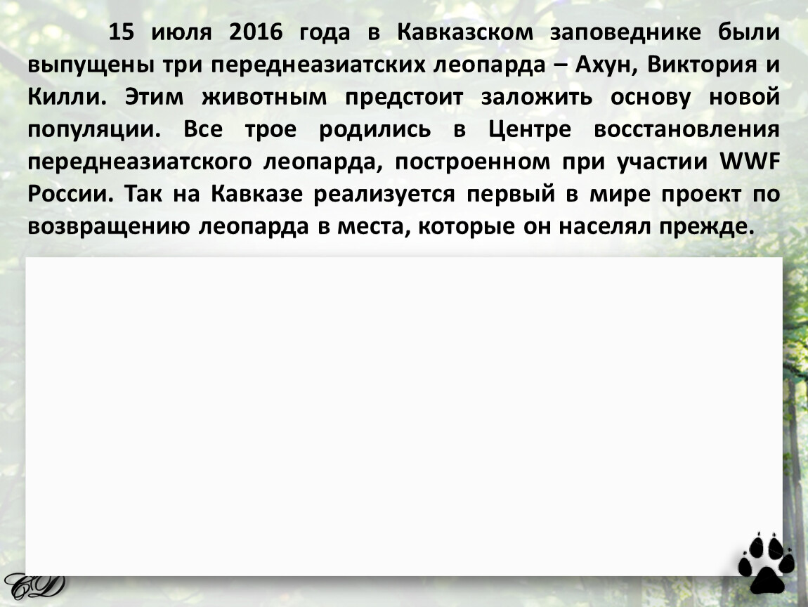 15 июля 2016 года в Кавказском заповеднике были выпущены три переднеазиатских леопарда – Ахун, Виктория и Килли. Этим животным предстоит заложить основу новой популяции. Все трое родились в Центре восстановления переднеазиатского леопарда, построенном при участии WWF России. Так на Кавказе реализуется первый в мире проект по возвращению леопарда в места, которые он населял прежде.
