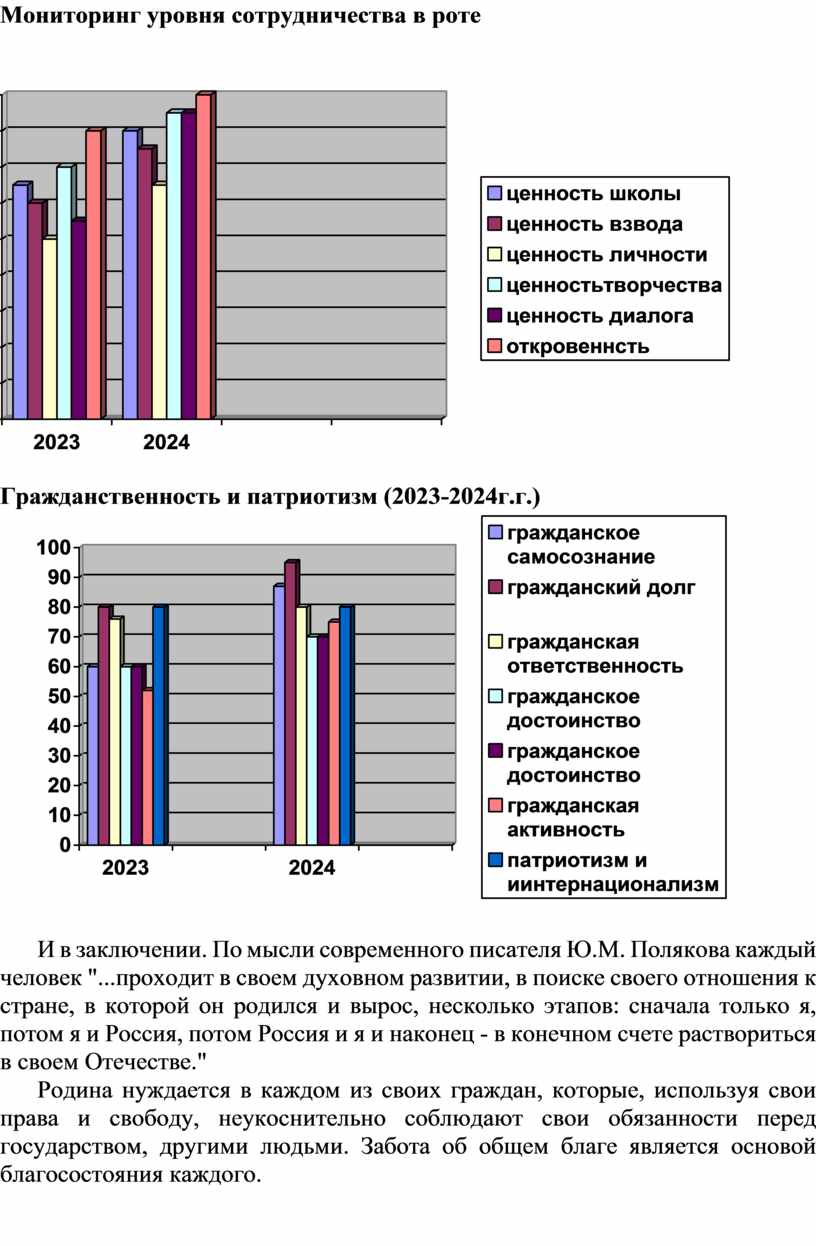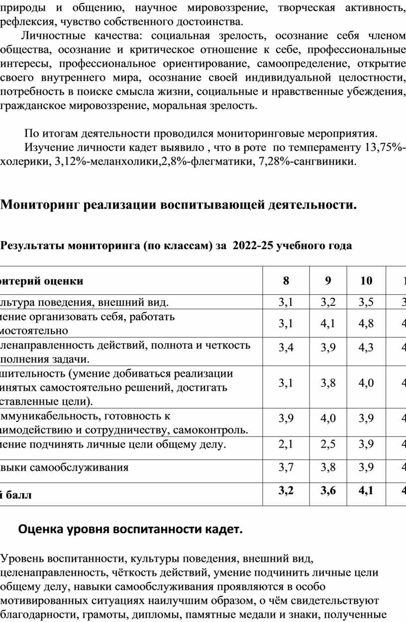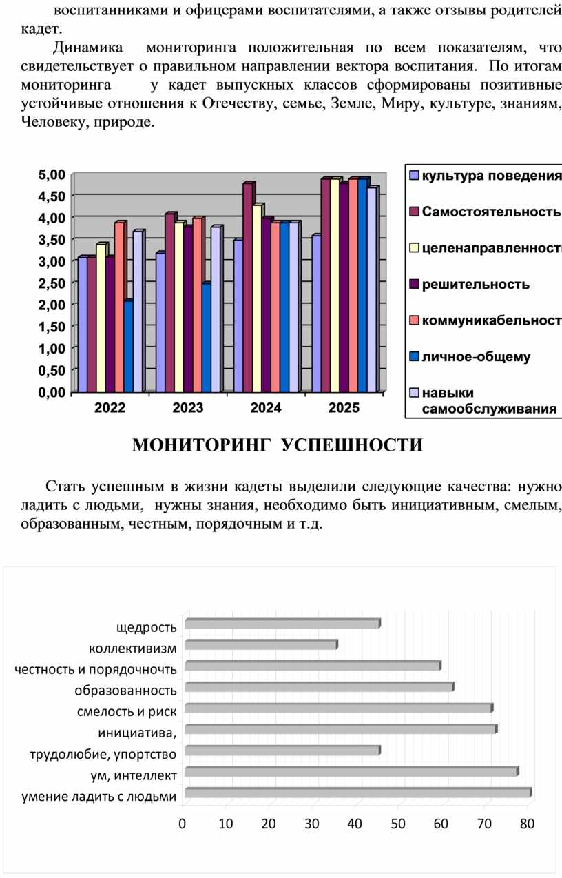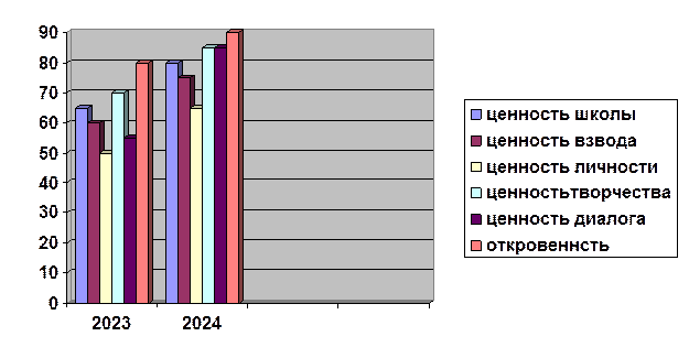 Динамика мониторинга положительная по всем показателям, что свидетельствует о правильном направлении вектора воспитания. По итогам мониторинга у кадет выпускных классов сформированы позитивные устойчивые отношения к Отечеству, семье, Земле, Миру, культуре, знаниям, Человеку, природе.