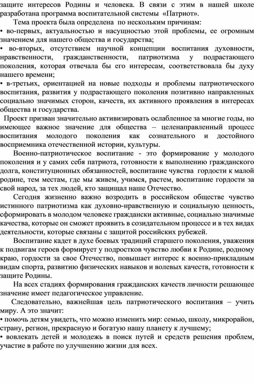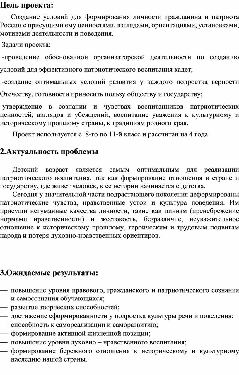 Проект ориентирован на пробуждение и развитие у кадет духовности, нравственности, патриотического сознания, высокой гражданственности, способности отдать силы, разум и энергию на благо России. А воспитание Гражданина Отечества является общей целью образовательной системы России, которая нашла отражение в Законе РФ «Об образовании в РФ».