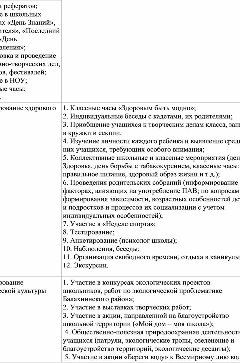 1. Создание социального паспорта класса, роты; 2. Проведение мероприятий с родителями, организация совместного досуга родителей и обучающихся (праздники семьи, экскурсии, походы, соревнования, трудовые акции и др.); 3. Клуб выходного дня; 4. Оказание помощи родителям в формировании нравственного образа семьи, в профилактике и диагностике наркомании, в предупреждении алкоголизма и других негативных проявлений у обучающихся; 5. Проведение открытых мероприятий для родителей; 6. Работа по выявлению семей, находящихся в социально опасном положении, оказанию им помощи в обучении и воспитании детей, индивидуальная работа с детьми из данных семей; 7. Проведение диагностики «Изучение удовлетворённости родителей работой школы»; 8. Проведение под руководством школьного психолога (социального педагога) групповых тренингов (семейно-ролевое взаимодействие, тренинг «эффективных» родителей). |