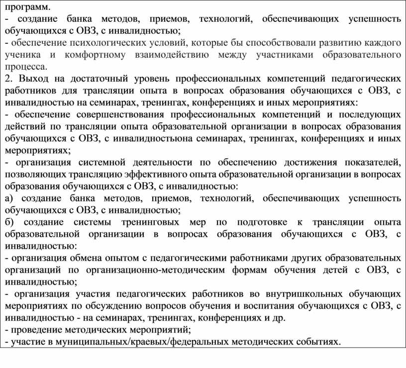 Модель «Полная интеграция» для детей с ОВЗ, проект «Академия успеха»: - созданиеинклюзивнойобразовательнойсреды; - созданиеусловий дляразвитияпотенциальныхвозможностейдетей с ОВЗ всовместнойдеятельностисосверстниками; - организациясистемыэффективногопсихолого-педагогическогосопровожденияпроцессаинклюзивногообразования. Проект «Академия успеха» 1. Формирование компетентности педагогических работников в выполнении трудовой функции по разработке образовательных программ в том числе адаптированных основных общеобразовательных программ и адаптированных дополнительных общеобразовательных программ: - модернизация методической деятельности в образовательной организации по развитию компетенций педагогических работников в вопросах программно-методического обеспечения обучения и воспитания по федеральным адаптированным образовательным программам (при наличии обучающихся с ОВЗ, с инвалидностью) посредством: - организации адресной организационно-методической помощи, внедрения методологий тьюторства, менторства и наставничества для персонифицированной помощи педагогическим работникам в вопросах программно-методического обеспечения обучения и воспитания по федеральным адаптированным образовательным программам; - обучения на курсах повышения квалификации по разработке и реализации адаптированных основных общеобразовательных программ и адаптированных дополнительных общеобразовательных программ. - создание банка методов, приемов, технологий, обеспечивающих успешность обучающихся с ОВЗ, с инвалидностью; - обеспечение психологических условий, которые бы способствовали развитию каждого ученика и комфортному взаимодействию между участниками образовательного процесса. 2. Выход на достаточный уровень профессиональных компетенций педагогических работников для трансляции опыта в вопросах образования обучающихся с ОВЗ, с инвалидностью на семинарах, тренингах, конференциях и иных мероприятиях: - обеспечение совершенствования профессиональных компетенций и последующих действий по трансляции опыта образовательной организации в вопросах образования обучающихся с ОВЗ, с инвалидностьюна семинарах, тренингах, конференциях и иных мероприятиях; - организация системной деятельности по обеспечению достижения показателей, позволяющих трансляцию эффективного опыта образовательной организации в вопросах образования обучающихся с ОВЗ, с инвалидностью: а) создание банка методов, приемов, технологий, обеспечивающих успешность обучающихся с ОВЗ, с инвалидностью; б) создание системы тренинговых мер по подготовке к трансляции опыта образовательной организации в вопросах образования обучающихся с ОВЗ, с инвалидностью: - организация обмена опытом с педагогическими работниками других образовательных организаций по организационно-методическим формам обучения детей с ОВЗ, с инвалидностью; - организация участия педагогических работников во внутришкольных обучающих мероприятиях по обсуждению вопросов обучения и воспитания обучающихся с ОВЗ, с инвалидностью - на семинарах, тренингах, конференциях и др. - проведение методических мероприятий; - участие в муниципальных/краевых/федеральных методических событиях. |