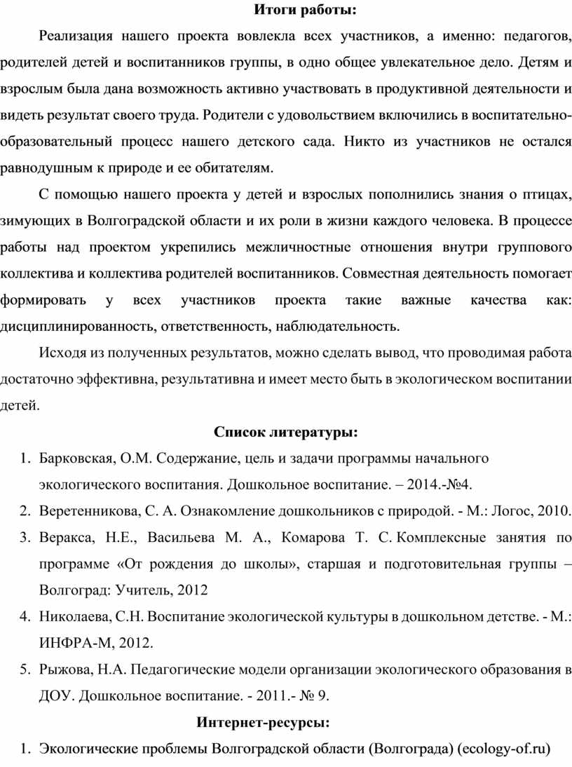 С помощью нашего проекта у детей и взрослых пополнились знания о птицах, зимующих в Волгоградской области и их роли в жизни каждого человека. В процессе работы над проектом укрепились межличностные отношения внутри группового коллектива и коллектива родителей воспитанников. Совместная деятельность помогает формировать у всех участников проекта такие важные качества как: дисциплинированность, ответственность, наблюдательность.