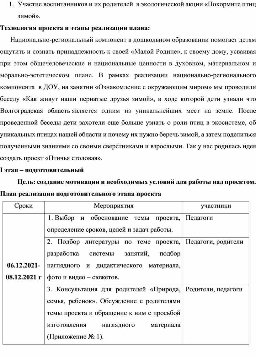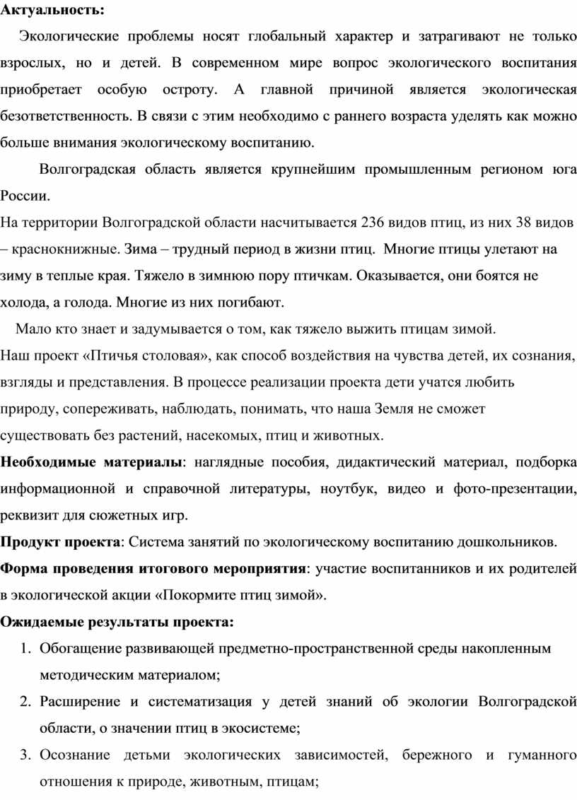 Национально-региональный компонент в дошкольном образовании помогает детям ощутить и сознать принадлежность к своей «Малой Родине», к своему дому, усваивая при этом общечеловеческие и национальные ценности в духовном, материальном и морально-эстетическом плане. В рамках реализации национально-регионального компонента в ДОУ, на занятии «Ознакомление с окружающим миром» мы проводили беседу «Как живут наши пернатые друзья зимой», в ходе которой дети узнали что Волгоградская область является одним из уникальнейших мест на земле. После проведенной беседы дети захотели еще больше узнать о роли птиц в экосистеме, об уникальных птицах нашей области и почему их нужно беречь зимой, а затем поделиться полученными знаниями со своими сверстниками и взрослыми. Так у нас родилась идея создать проект «Птичья столовая».