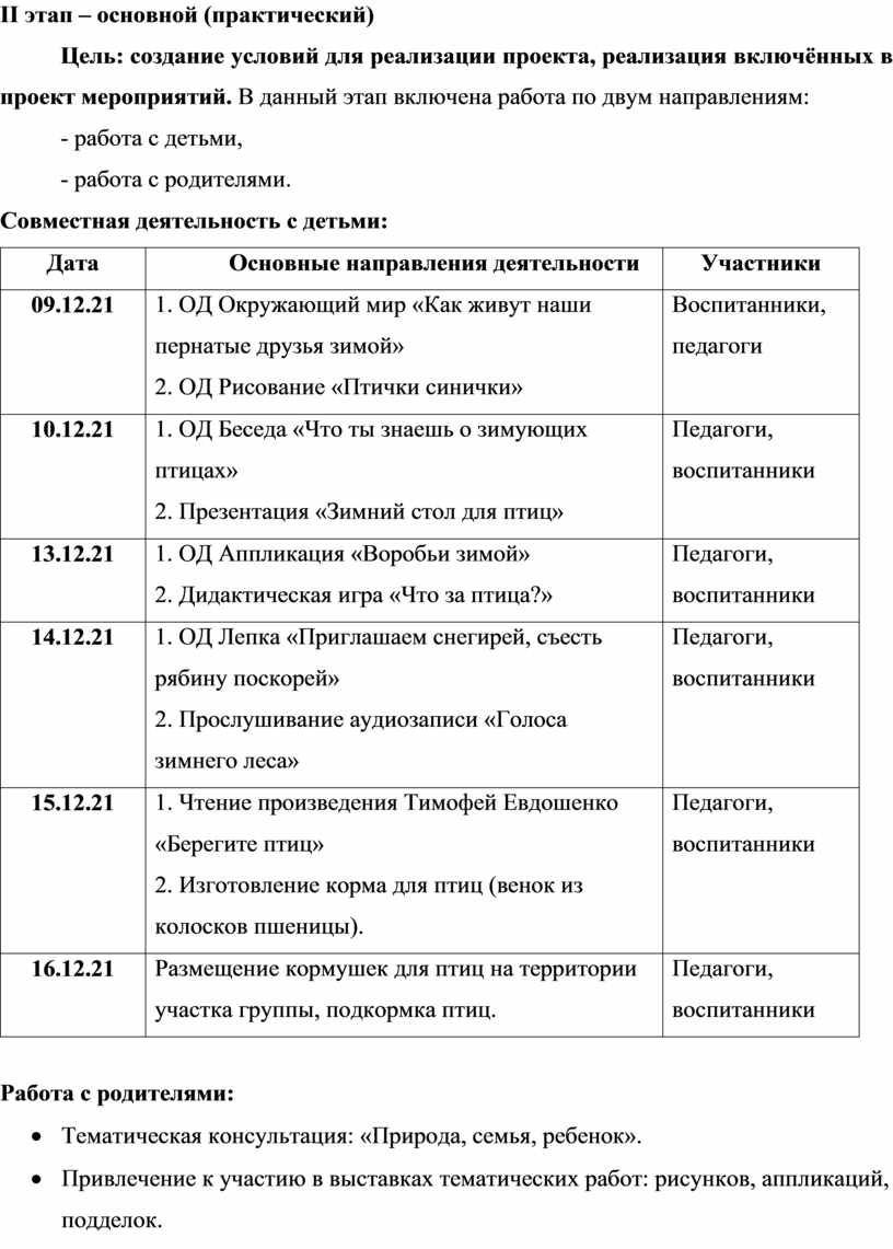 Цель проекта: сформирование у детей понимания роли птиц как компонента экосистем, изучение разнообразия зимующих птиц нашей местности, их образа жизни и поведения, оказание посильной помощи братьям нашим меньшим и сохранение их численности в трудный зимний период.