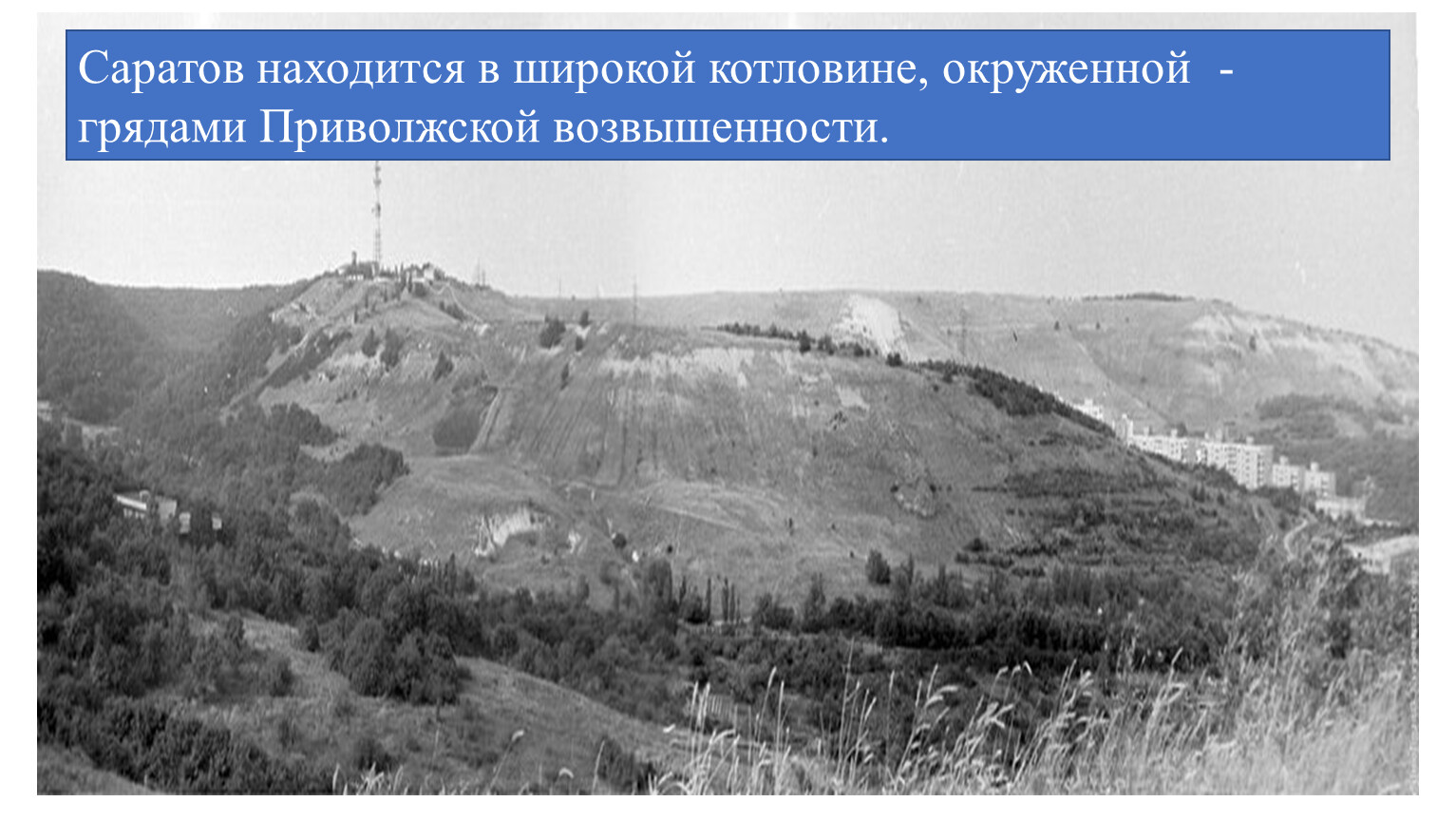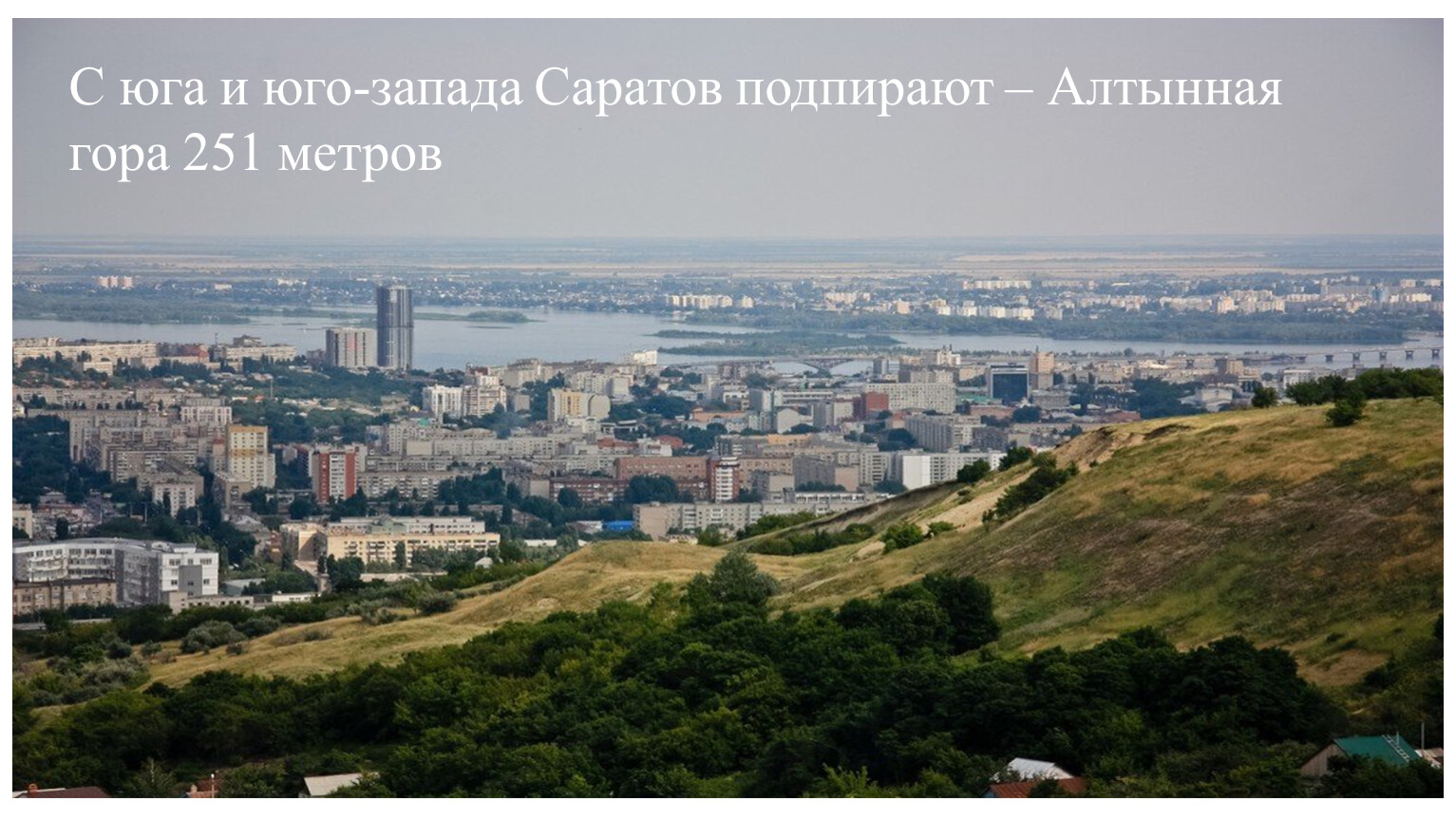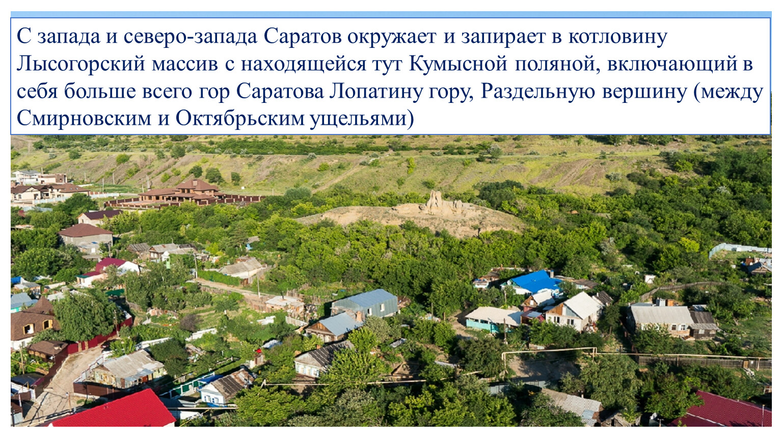 С запада и северо-запада Саратов окружает и запирает в котловину Лысогорский массив с находящейся тут Кумысной поляной, включающий в себя больше всего гор Саратова Лопатину гору, Раздельную вершину (между Смирновским и Октябрьским ущельями)