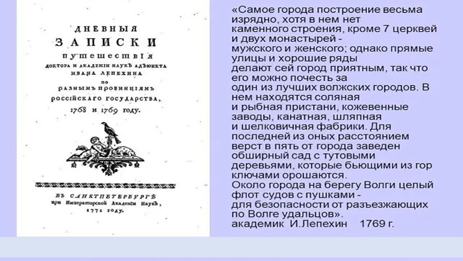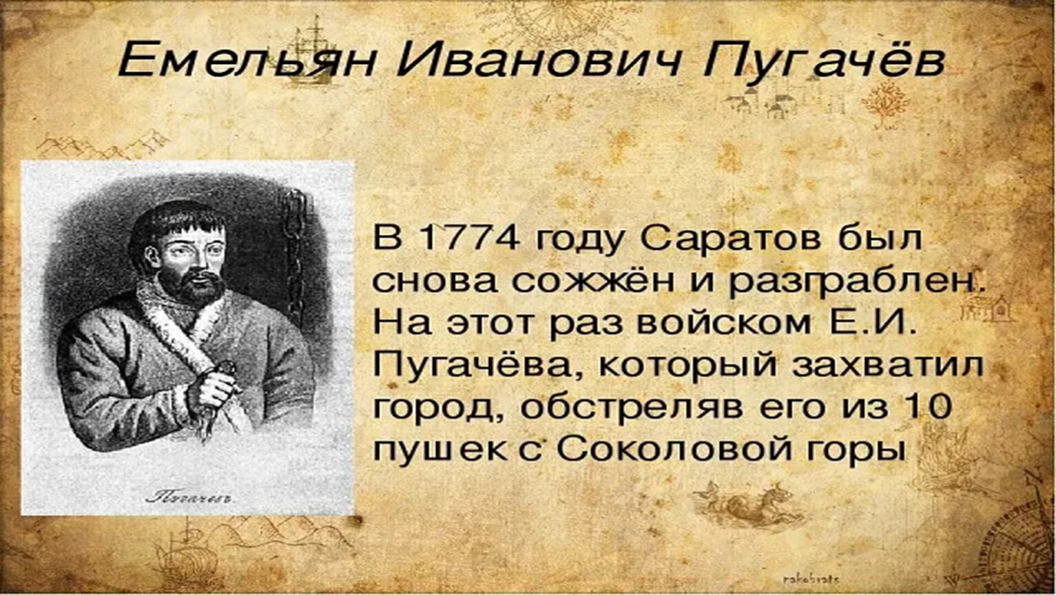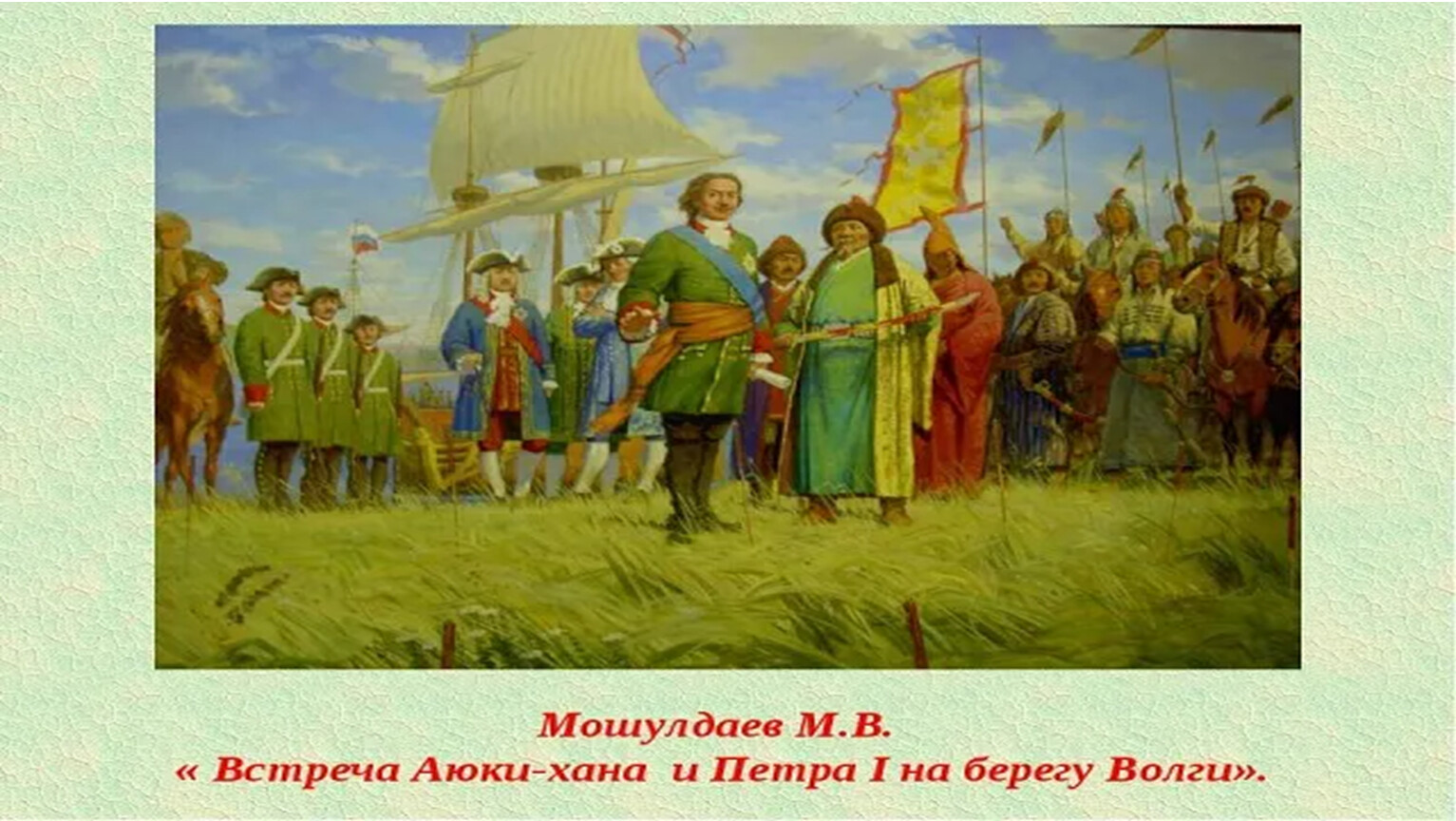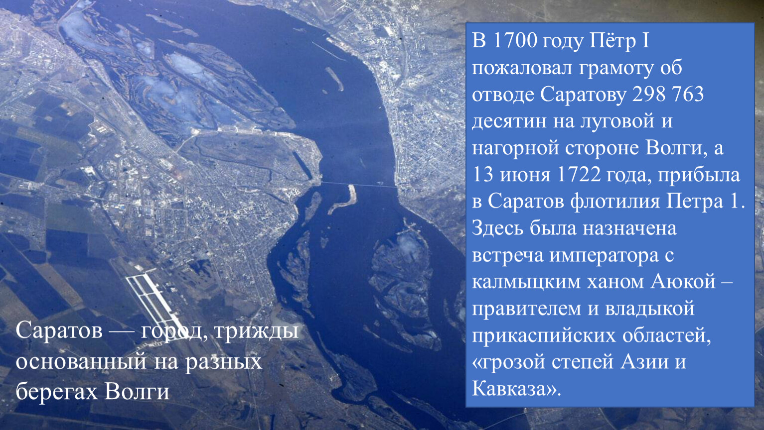 В 1700 году Пётр I пожаловал грамоту об отводе Саратову 298 763 десятин на луговой и нагорной стороне Волги, а 13 июня 1722 года, прибыла в Саратов флотилия Петра 1. Здесь была назначена встреча императора с калмыцким ханом Аюкой – правителем и владыкой прикаспийских областей, «грозой степей Азии и Кавказа».