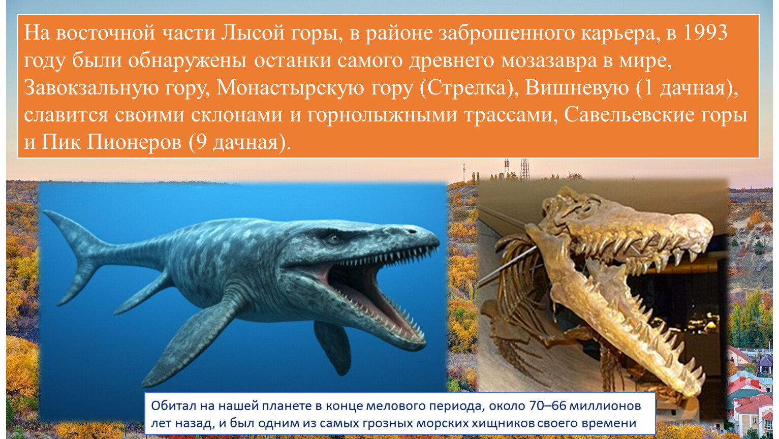 На восточной части Лысой горы, в районе заброшенного карьера, в 1993 году были обнаружены останки самого древнего мозазавра в мире, Завокзальную гору, Монастырскую гору (Стрелка), Вишневую (1 дачная), славится своими склонами и горнолыжными трассами, Савельевские горы и Пик Пионеров (9 дачная).