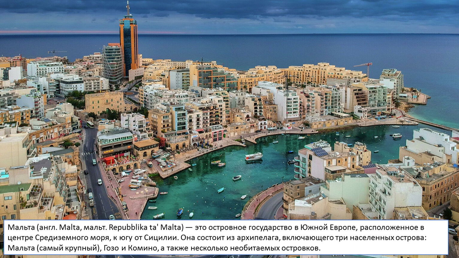Мальта (англ. Malta, мальт. Repubblika ta' Malta) — это островное государство в Южной Европе, расположенное в центре Средиземного моря, к югу от Сицилии. Она состоит из архипелага, включающего три населенных острова: Мальта (самый крупный), Гозо и Комино, а также несколько необитаемых островков.
