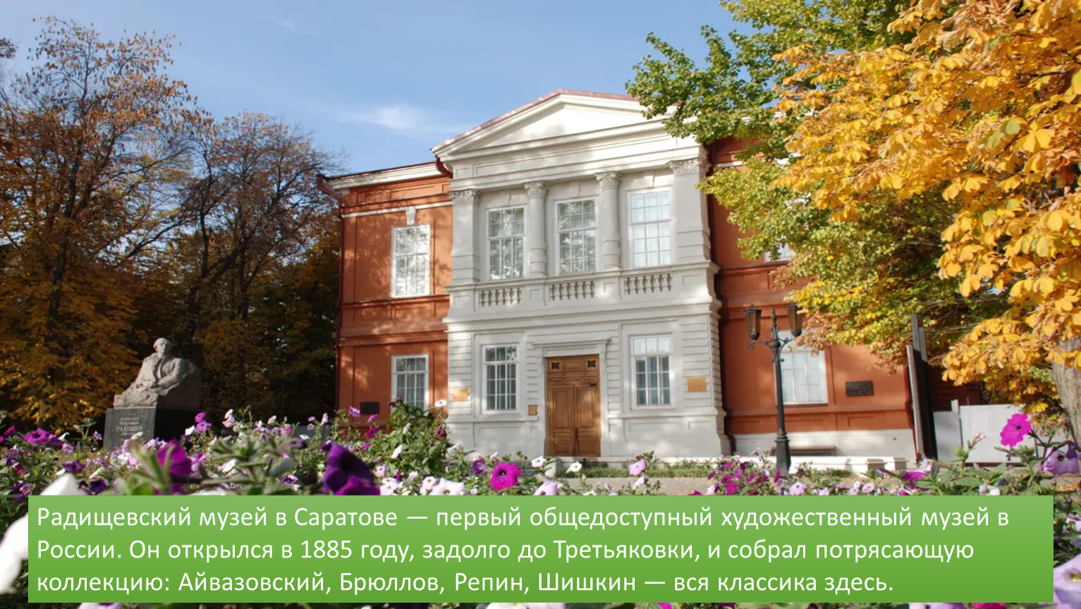 Радищевский музей в Саратове — первый общедоступный художественный музей в России. Он открылся в 1885 году, задолго до Третьяковки, и собрал потрясающую коллекцию: Айвазовский, Брюллов, Репин, Шишкин — вся классика здесь.