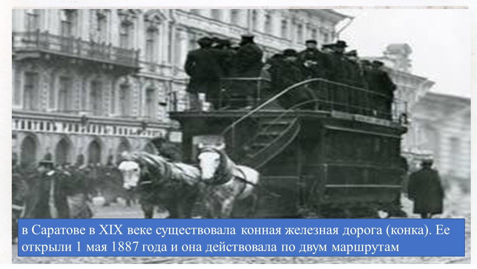 в Саратове в XIX веке существовала конная железная дорога (конка). Ее открыли 1 мая 1887 года и она действовала по двум маршрутам