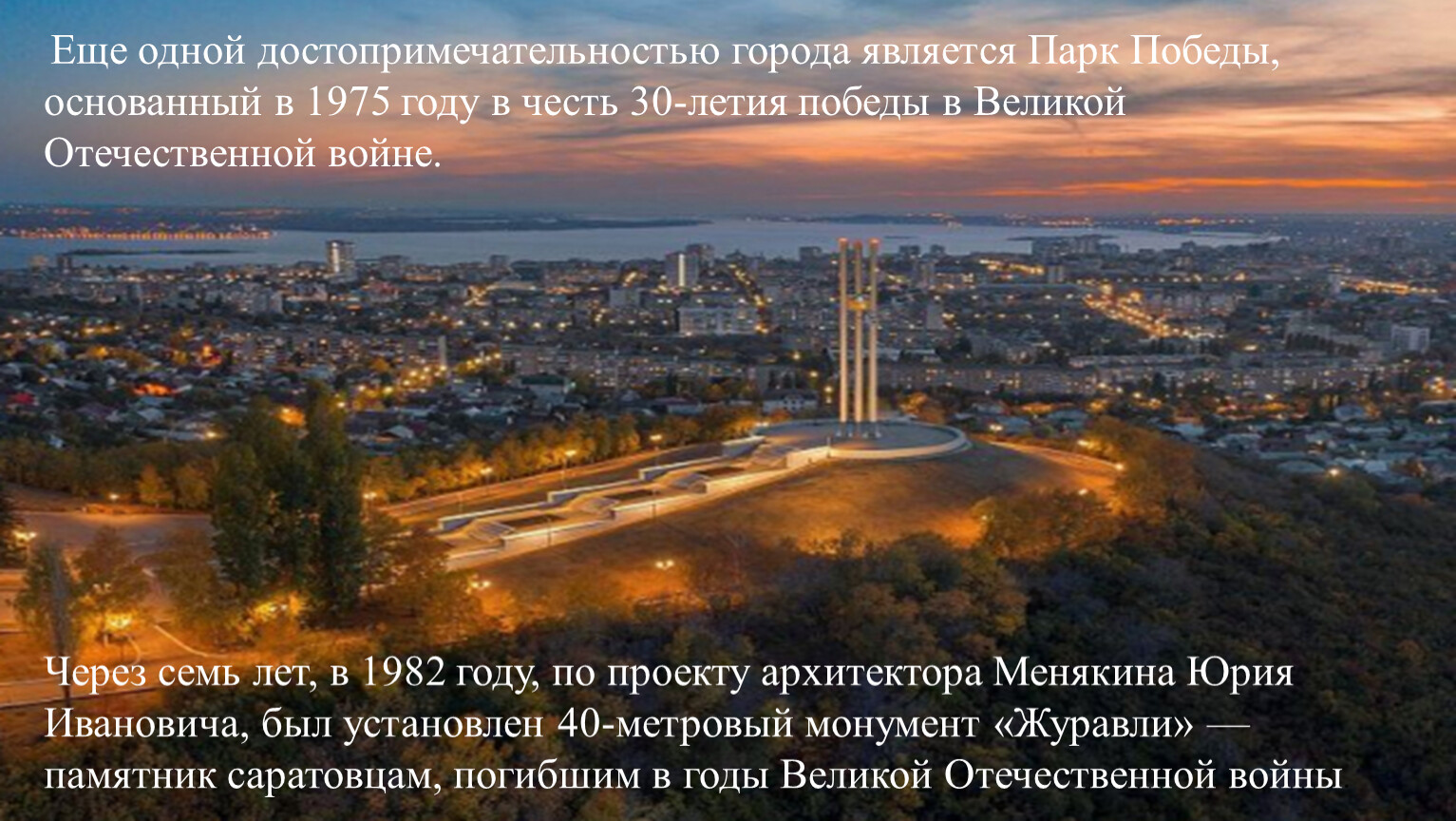 Через семь лет, в 1982 году, по проекту архитектора Менякина Юрия Ивановича, был установлен 40-метровый монумент «Журавли» — памятник саратовцам, погибшим в годы Великой Отечественной войны.