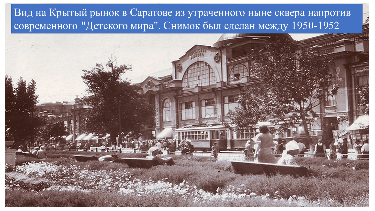Вид на Крытый рынок в Саратове из утраченного ныне сквера напротив современного "Детского мира". Снимок был сделан между 1950-1952