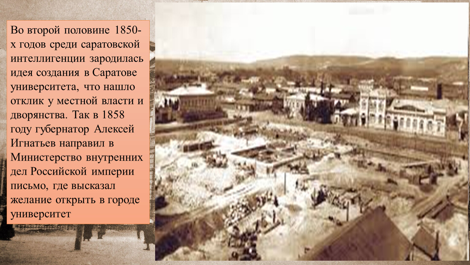 Во второй половине 1850-х годов среди саратовской интеллигенции зародилась идея создания в Саратове университета, что нашло отклик у местной власти и дворянства. Так в 1858 году губернатор Алексей Игнатьев направил в Министерство внутренних дел Российской империи письмо, где высказал желание открыть в городе университет