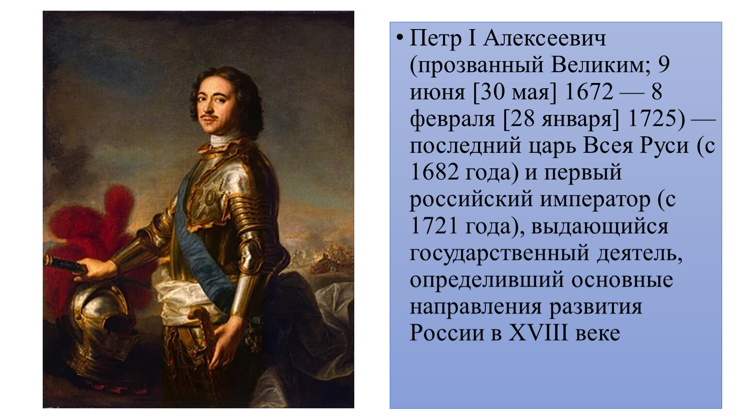 Петр I Алексеевич (прозванный Великим; 9 июня [30 мая] 1672 — 8 февраля [28 января] 1725) — последний царь Всея Руси (с 1682 года) и первый российский император (с 1721 года), выдающийся государственный деятель, определивший основные направления развития России в XVIII веке