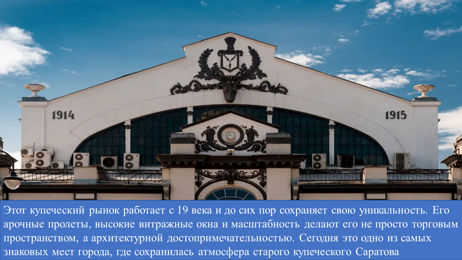 Этот купеческий рынок работает с 19 века и до сих пор сохраняет свою уникальность. Его арочные пролеты, высокие витражные окна и масштабность делают его не просто торговым пространством, а архитектурной достопримечательностью. Сегодня это одно из самых знаковых мест города, где сохранилась атмосфера старого купеческого Саратова