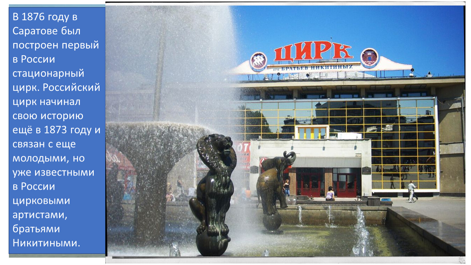 В 1876 году в Саратове был построен первый в России стационарный цирк. Российский цирк начинал свою историю ещё в 1873 году и связан с еще молодыми, но уже известными в России цирковыми артистами, братьями Никитиными.