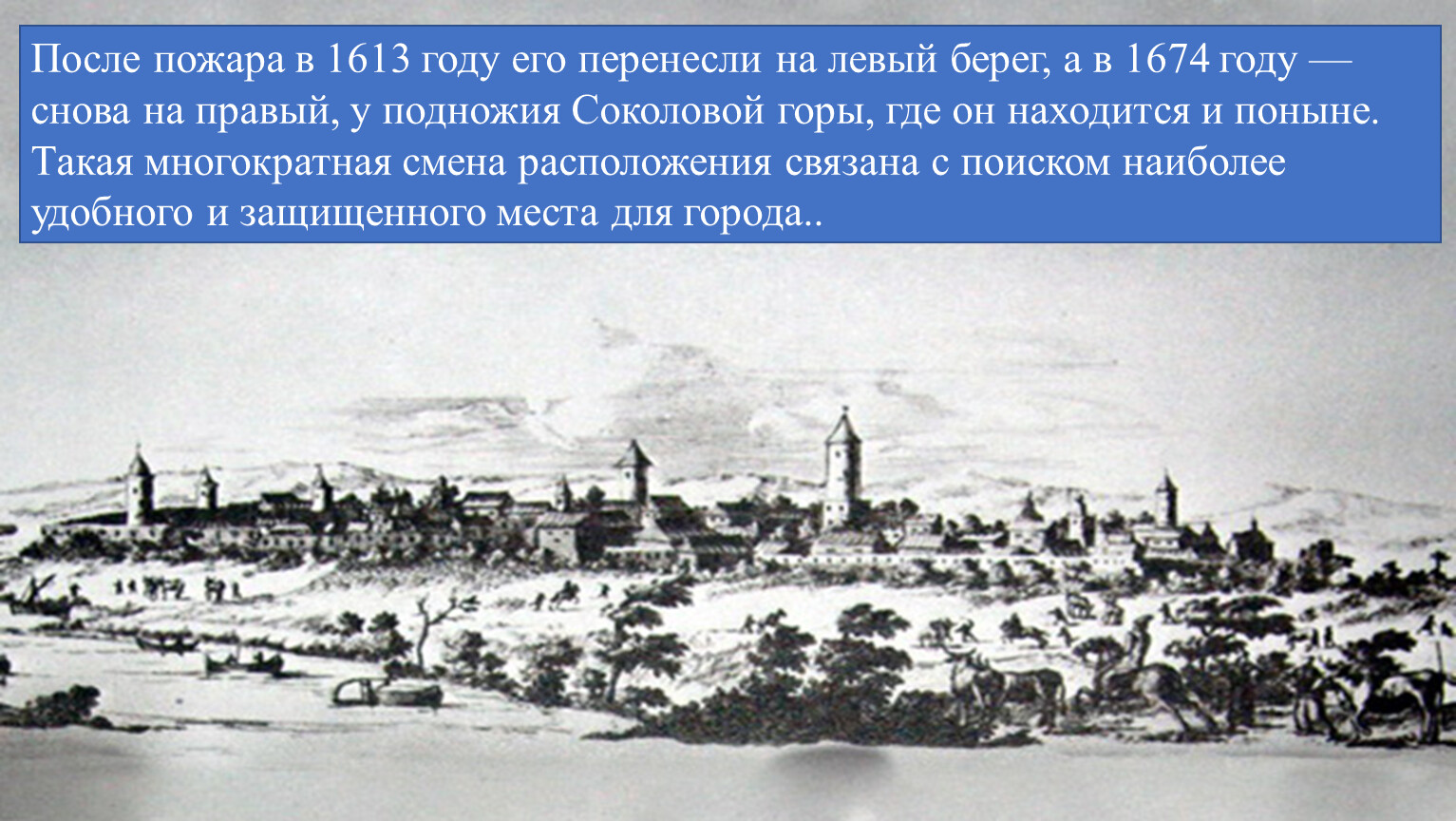 После пожара в 1613 году его перенесли на левый берег, а в 1674 году — снова на правый, у подножия Соколовой горы, где он находится и поныне. Такая многократная смена расположения связана с поиском наиболее удобного и защищенного места для города..