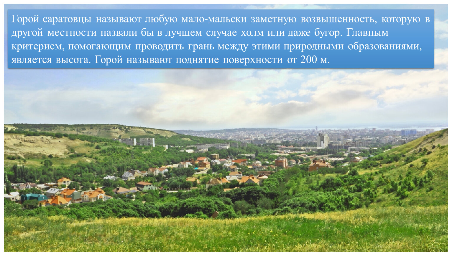 Горой саратовцы называют любую мало-мальски заметную возвышенность, которую в другой местности назвали бы в лучшем случае холм или даже бугор. Главным критерием, помогающим проводить грань между этими природными образованиями, является высота. Горой называют поднятие поверхности от 200 м.