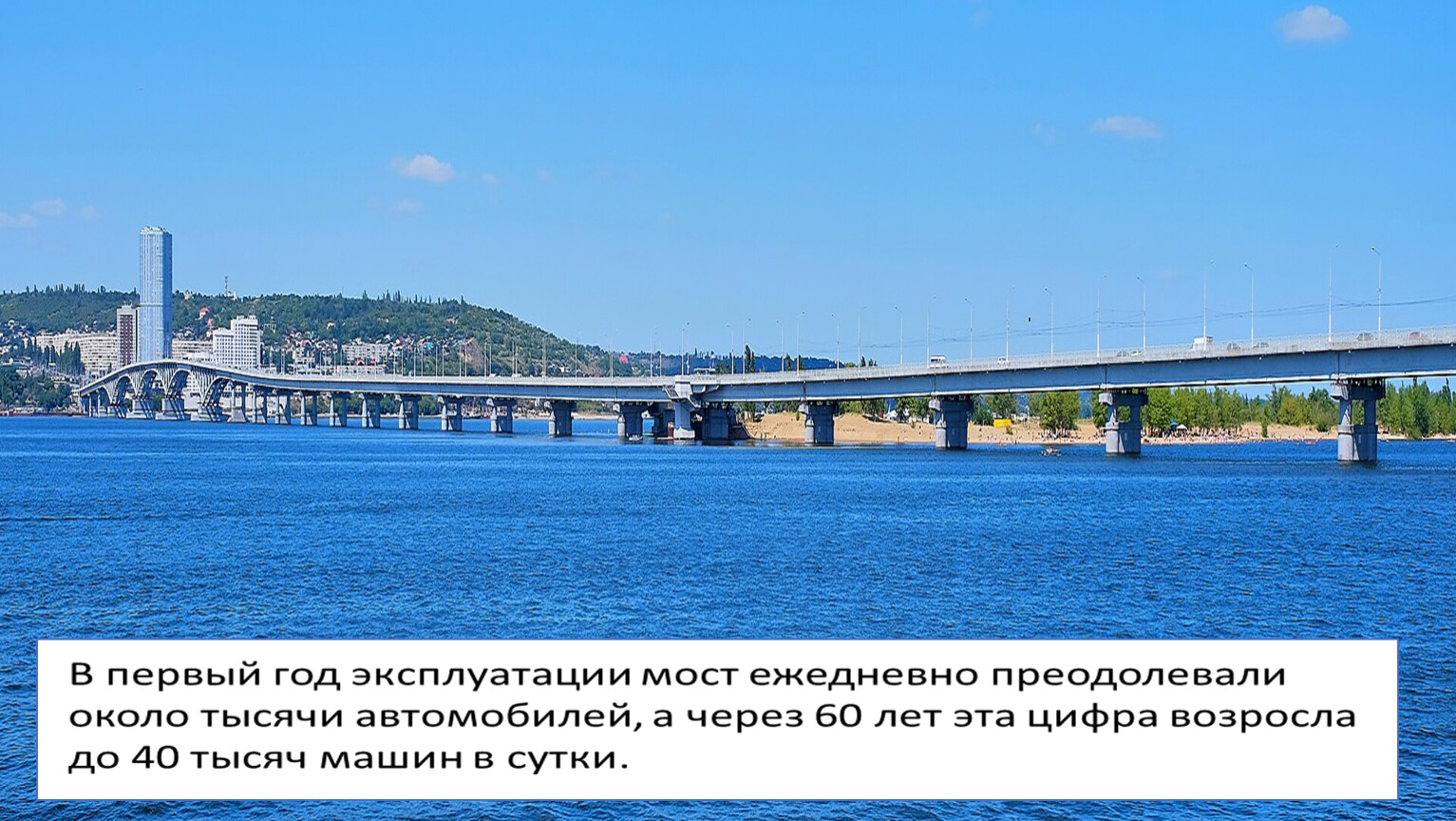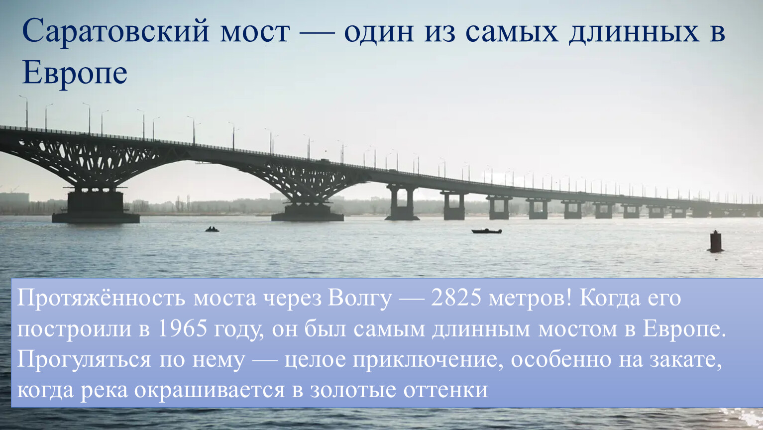 Протяжённость моста через Волгу — 2825 метров! Когда его построили в 1965 году, он был самым длинным мостом в Европе. Прогуляться по нему — целое приключение, особенно на закате, когда река окрашивается в золотые оттенки
