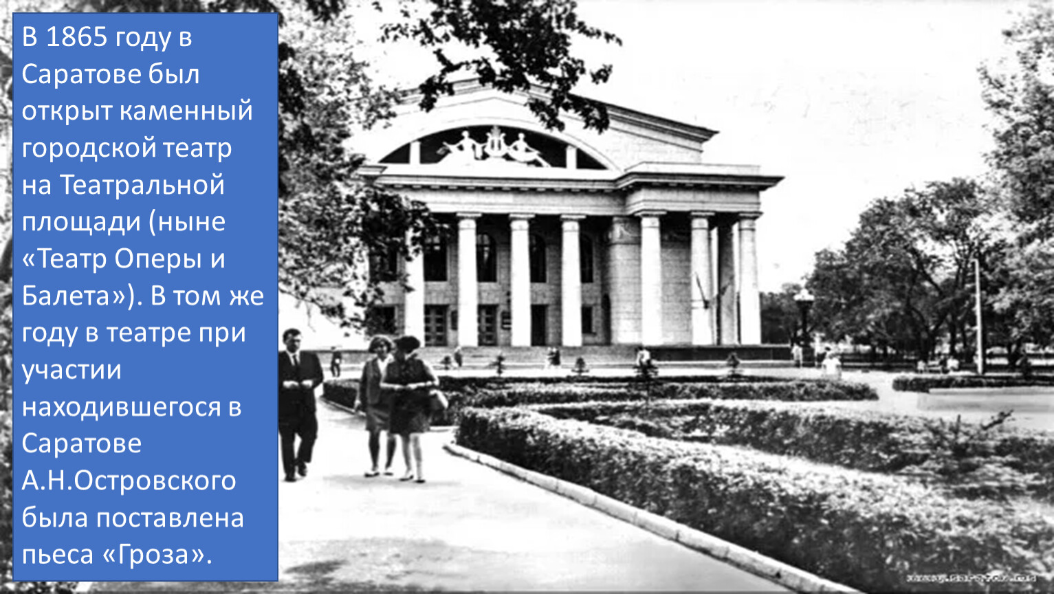 В 1865 году в Саратове был открыт каменный городской театр на Театральной площади (ныне «Театр Оперы и Балета»). В том же году в театре при участии находившегося в Саратове А.Н.Островского была поставлена пьеса «Гроза».