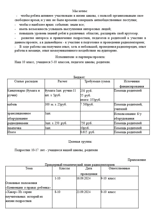 - создание школьного радио для развития информационного просвещения, учащихся, формирования и развития информационной грамотности учащихся путем проведения радиолекториев, раскрытия творческого потенциала учащихся через участие в проекте