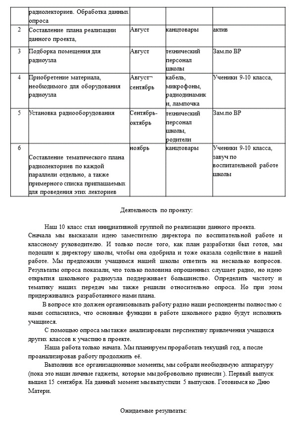 Сначала мы высказали идею заместителю директора по воспитательной работе и классному руководителю. И только после того, как план разработки был готов, мы подошли к директору школы, чтобы она одобрила и тоже оказала содействие в нашей работе. Мы предложили учащимся нашей школы ответить на несколько вопросов. Результаты опроса показали, что только половина опрошенных слушает радио, но идею открытия школьного радиоузла поддерживает большинство. Определить частоту и тематику наших передач мы также решили относительно опроса. Но при этом придерживались разработанного нами плана.