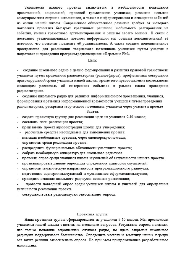 Значимость данного проекта заключается в необходимости повышения нравственной, социальной, правовой грамотности учащихся, развития навыков самоуправления старших школьников, а также в информировании и освещении событий из жизни нашей школы. Современное общественное развитие требует от молодого поколения принятия быстрых креативных решений, мобильного реагирования на события, умения грамотного аргументирования и защиты своего мнения. В связи с постоянно увеличивающимся потоком информации мы создаем дополнительный её источник, что позволит повысить её усваиваемость. А также создаем дополнительное пространство для реализации творческого потенциала учащихся путем участия в подготовке и проведения программ радиовещания «Перемена FM»
