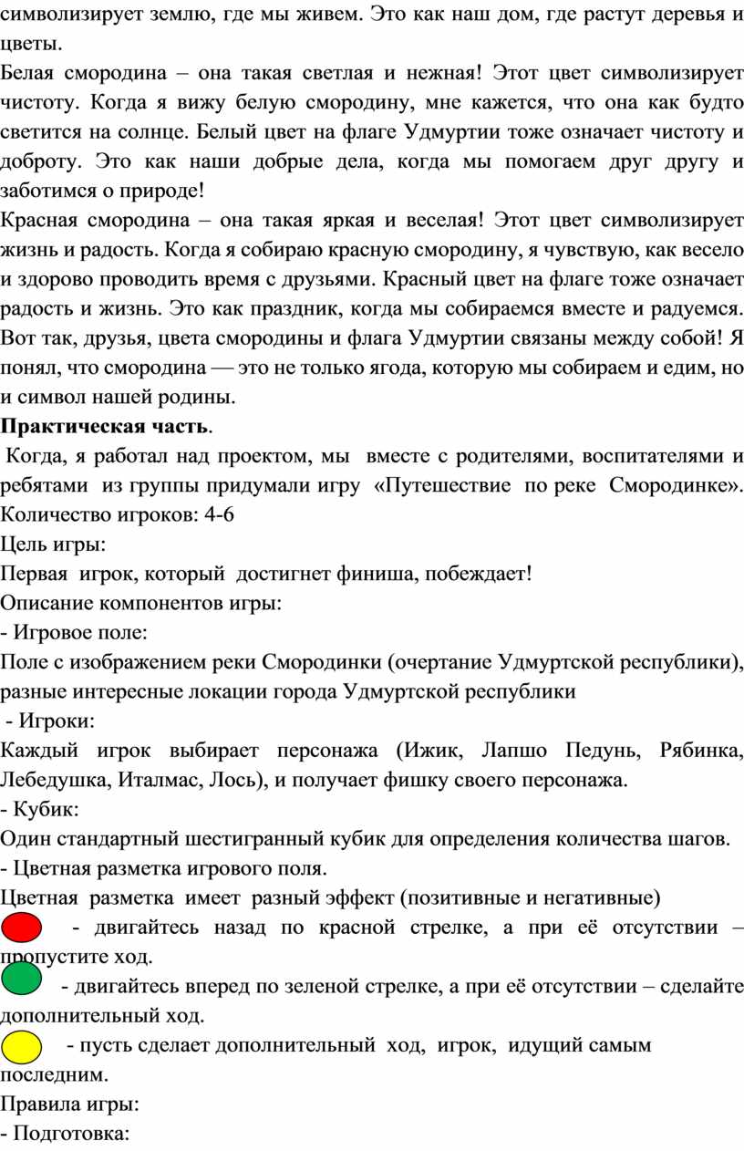 Когда, я работал над проектом, мы вместе с родителями, воспитателями и ребятами из группы придумали игру «Путешествие по реке Смородинке». Количество игроков: 4-6