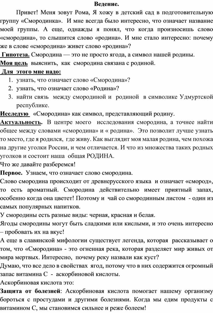 Привет! Меня зовут Рома, Я хожу в детский сад в подготовительную группу «Смородинка». И мне всегда было интересно, что означает название моей группы. А еще, однажды я понял, что когда произносишь слово «смородина», то слышится слово «родина». И мне стало интересно: почему же в слове «смородина» живет слово «родина»?