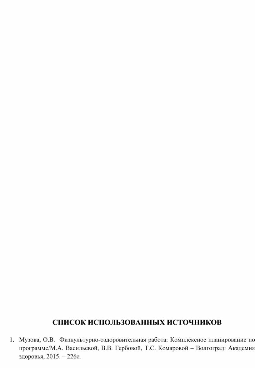1. Музова, О.В. Физкультурно-оздоровительная работа: Комплексное планирование по программе/М.А. Васильевой, В.В. Гербовой, Т.С. Комаровой – Волгоград: Академия здоровья, 2015. – 226c.