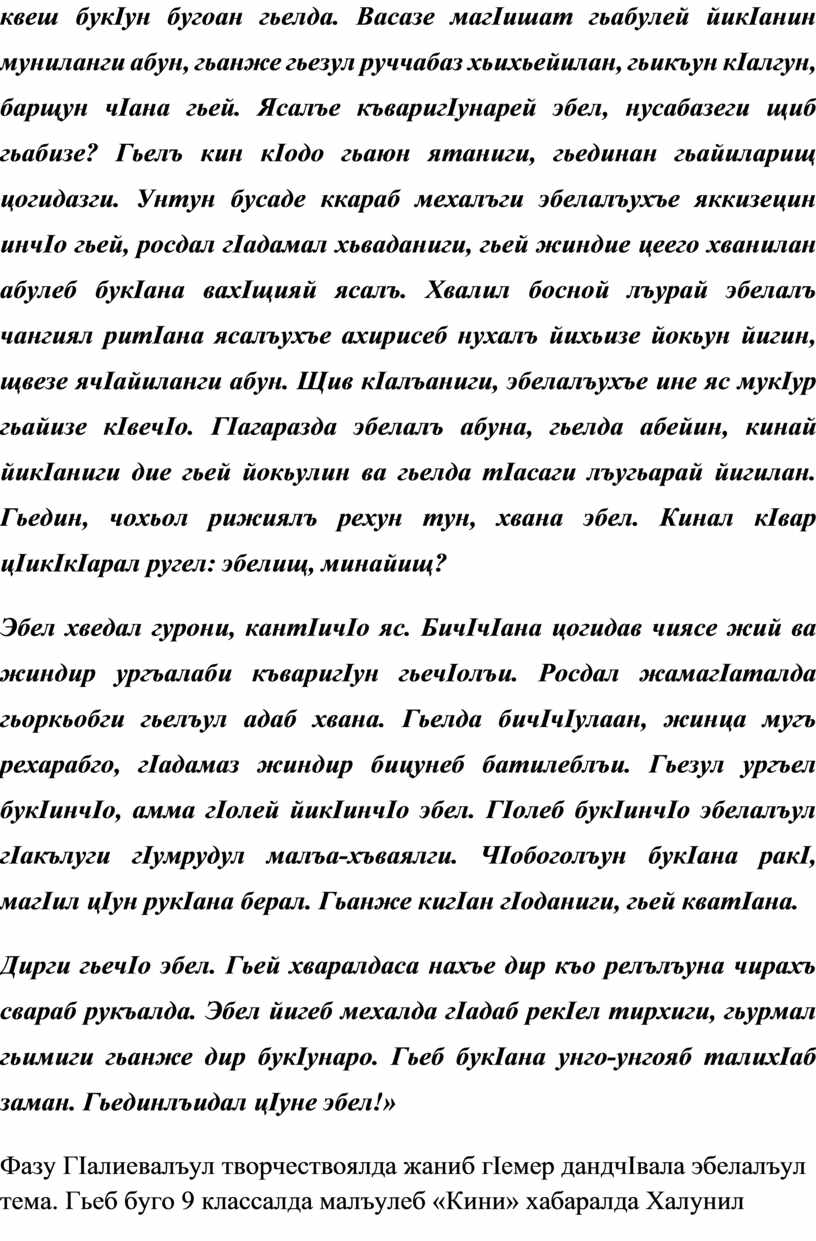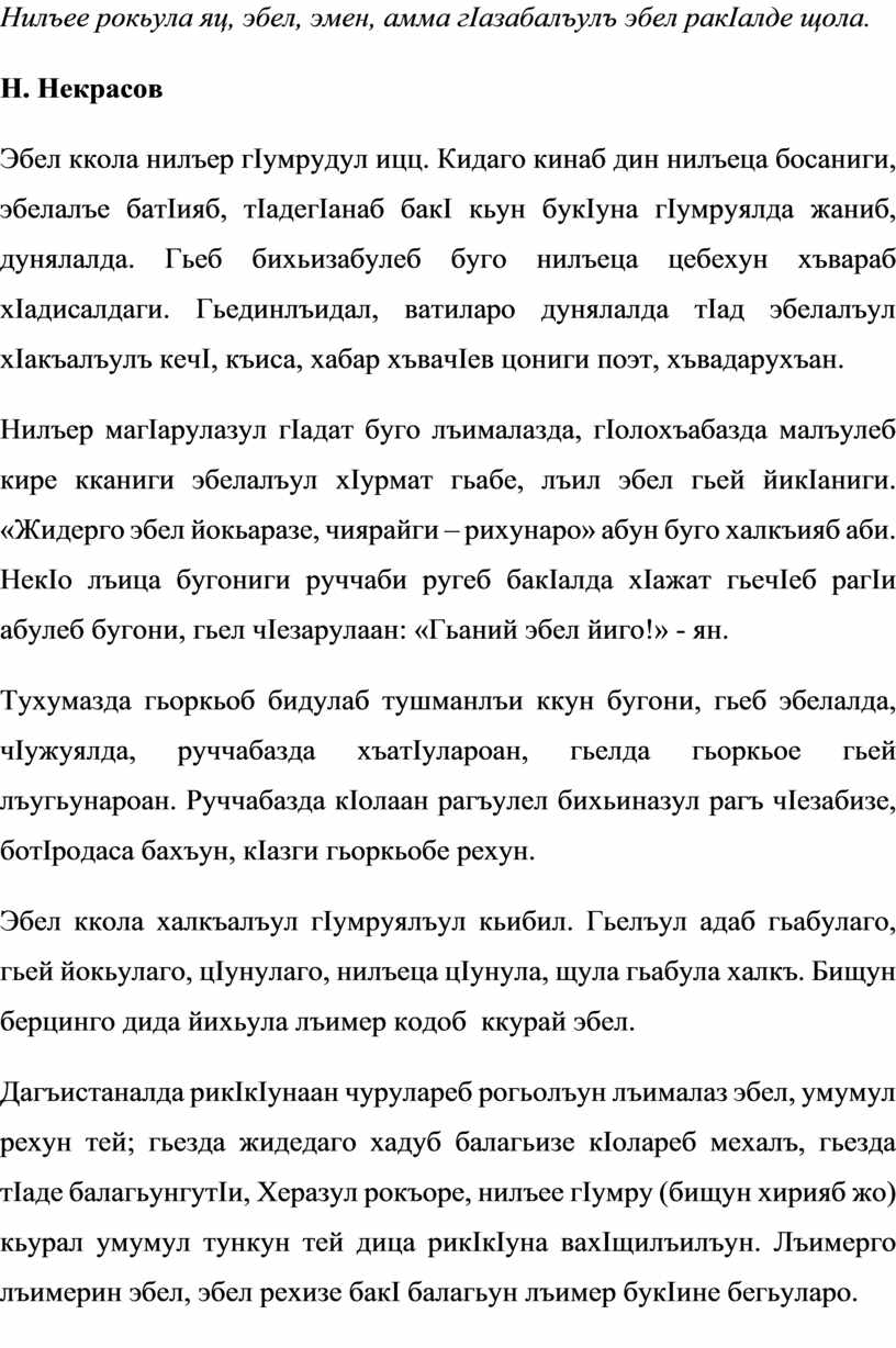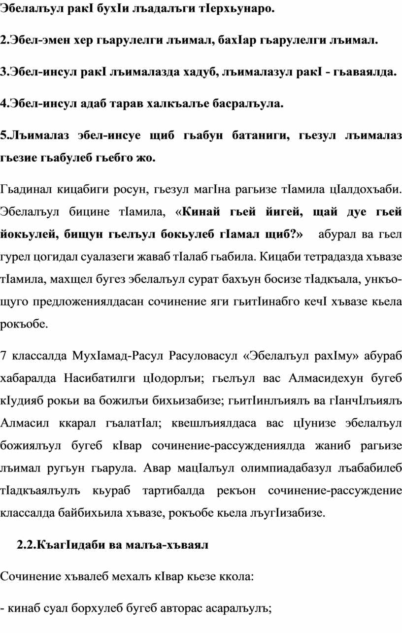 2) Текстазда тIасан сочинение-рассуждение хъвала. КIвар кьола эбелалъул сипаталъе, лъималазул лъикIал ва квешал рахъазе. Квешаб рахъ бугони, лъикIалъул мисалгун дандеккола. Лъималазул сипат-рахъ бугони, квешалдеги кIвар кьола. Гьедин букIине бегьуларо абураб пикруялде рачIуна. (декабрь 2015 г.)