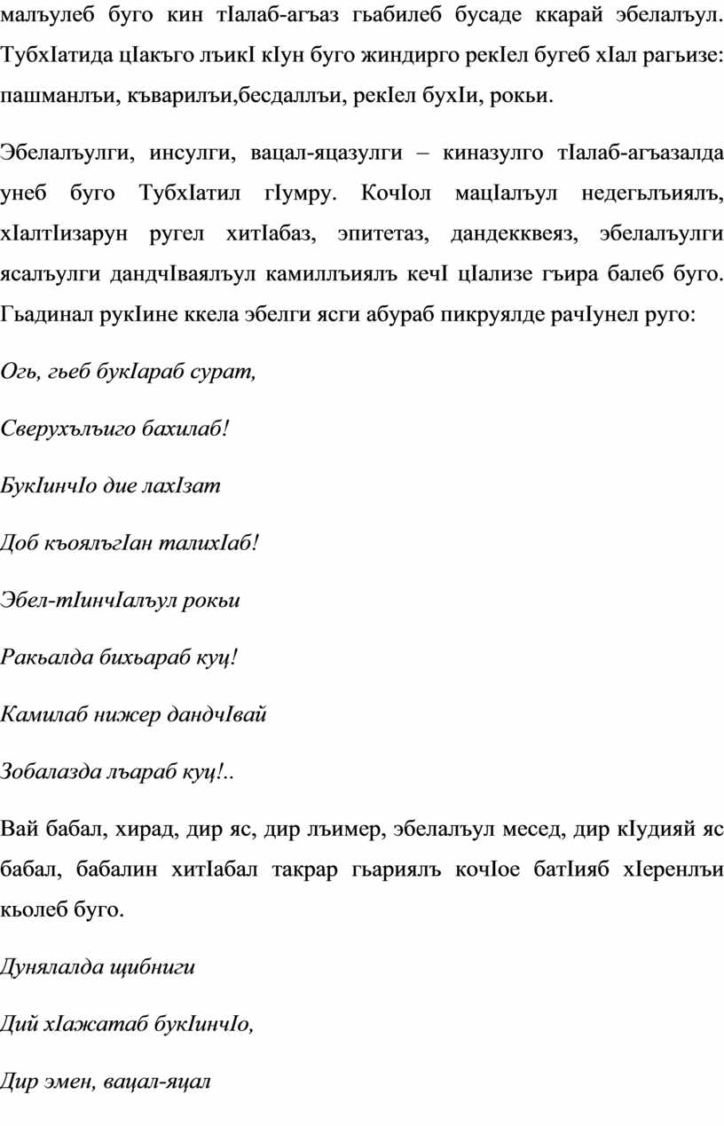 Эбелалъулги, инсулги, вацал-яцазулги – киназулго тIалаб-агъазалда унеб буго ТубхIатил гIумру. КочIол мацIалъул недегьлъиялъ, хIалтIизарун ругел хитIабаз, эпитетаз, дандекквеяз, эбелалъулги ясалъулги дандчIваялъул камиллъиялъ кечI цIализе гъира балеб буго. Гьадинал рукIине ккела эбелги ясги абураб пикруялде рачIунел руго: