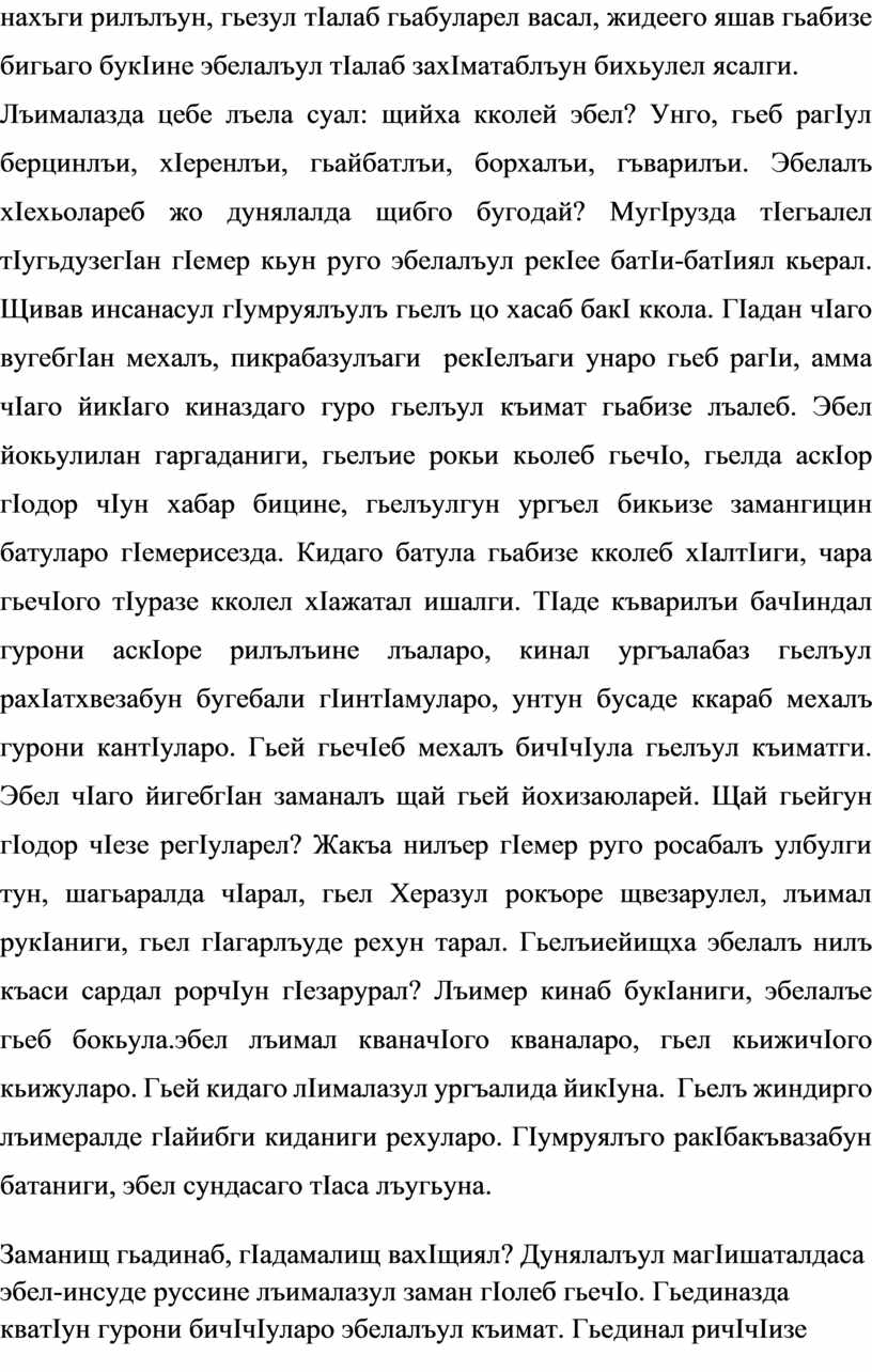 Гьединаб букIине кколин гIумруян бихьизабила лъималазда. Унтарабго, щибгIаги къварилъи ккарабго гурелги, ккечIониги, гьадинго ургъел бикьизеги аскIоре щвезе ккола умумузда, гьезда аскIор чIун тIалаб-агъаз гьабизе ккола. Росуги тун, Дагъистанги тун ун, цо-цо нилъер росуцоял росулъе щвечIого, эбел-эмен рихьичIого щуго-анлъго сон баралги руго. Гьедин бегьуларо. Гьеб буго гьаб ахираб заманалъул «унти». Эбелалъул ракIги, пикрабиги, ургъелалги – кинабго лъималазда тIад букIуна. «Щибдай буго? Кивдай вуго? Вакъун вугодай? ГIарац бугодай?» абурал пикрабазда, ургъалида рукIуна улбул. Улбул рехун тоге, цIуне улбул кинабго квешабщиналдаса, лъикIаб гурони рагIизе тоге нужер рахъалъ. Эбелги йокьа, росуги бокьа, Дагъистанги бокьа, Россияги бокьа. Гьел гьечIони, гьечIо нилъ!