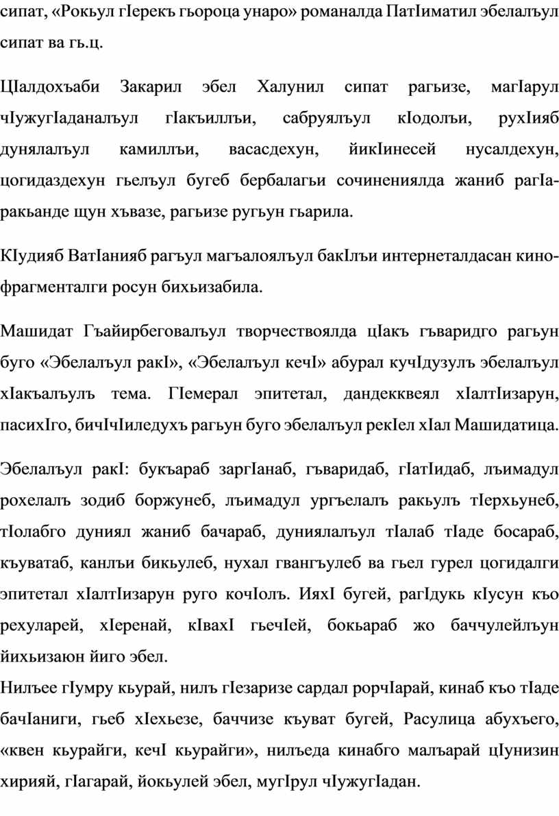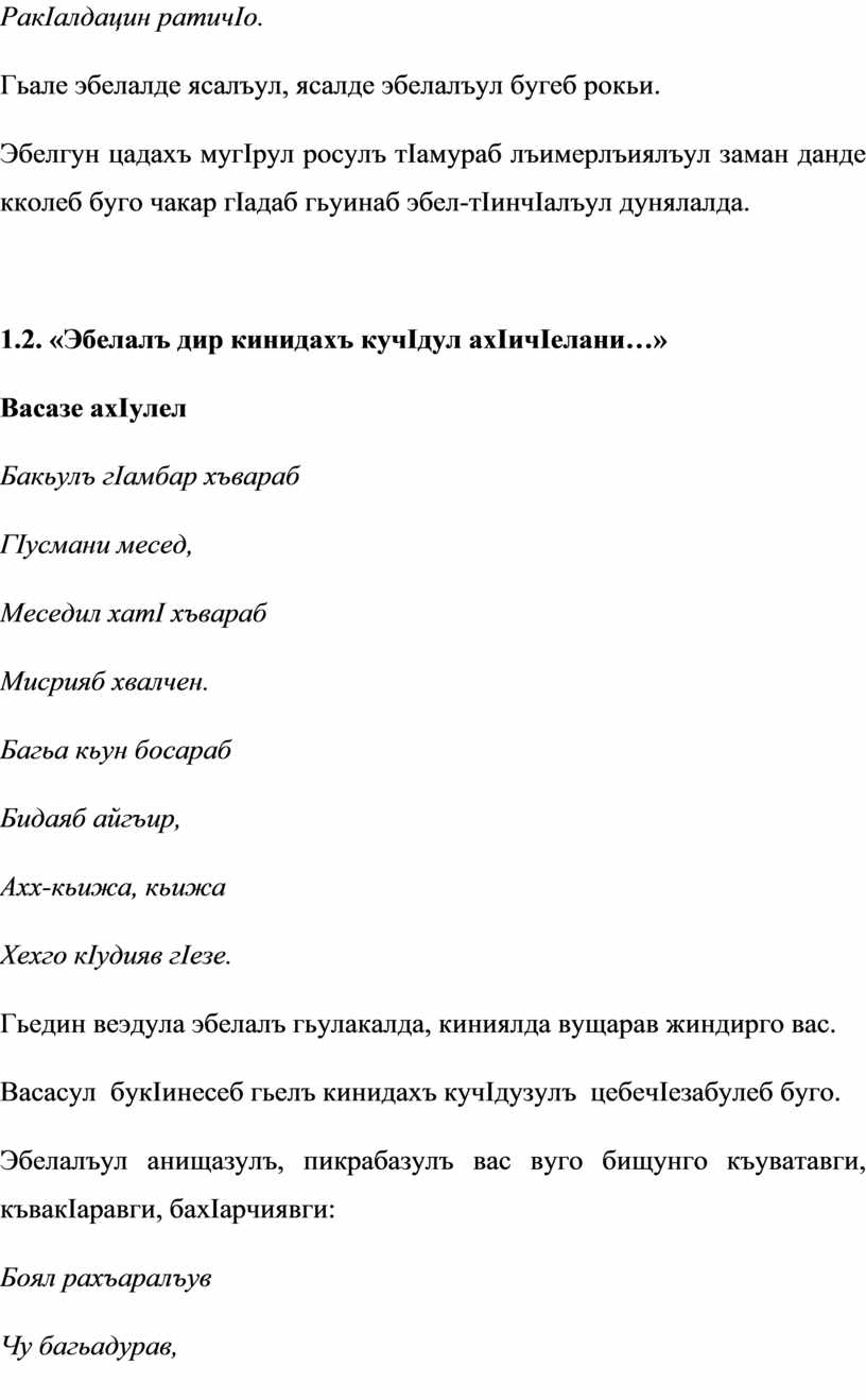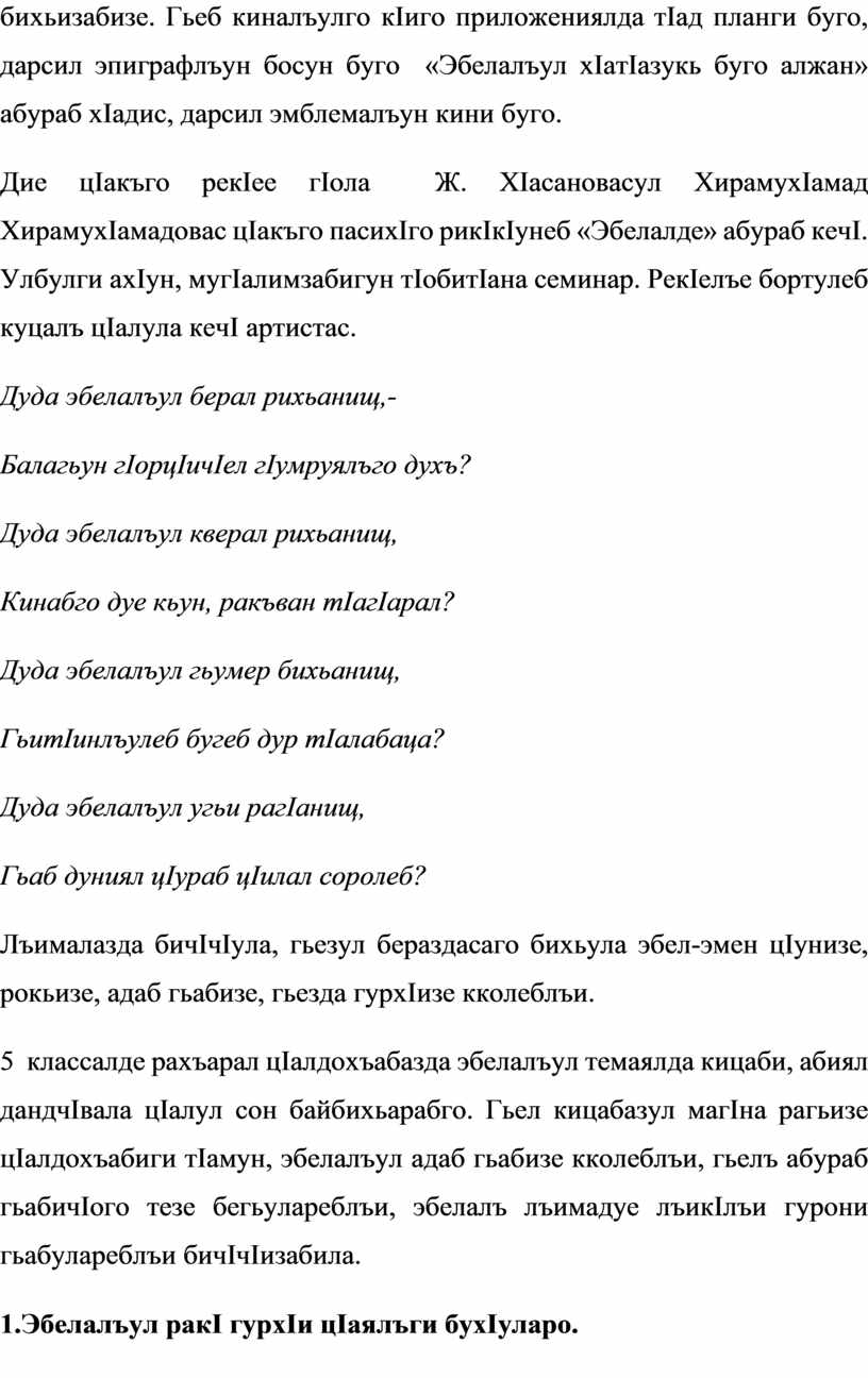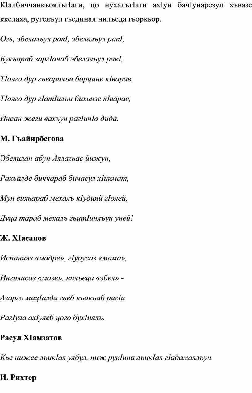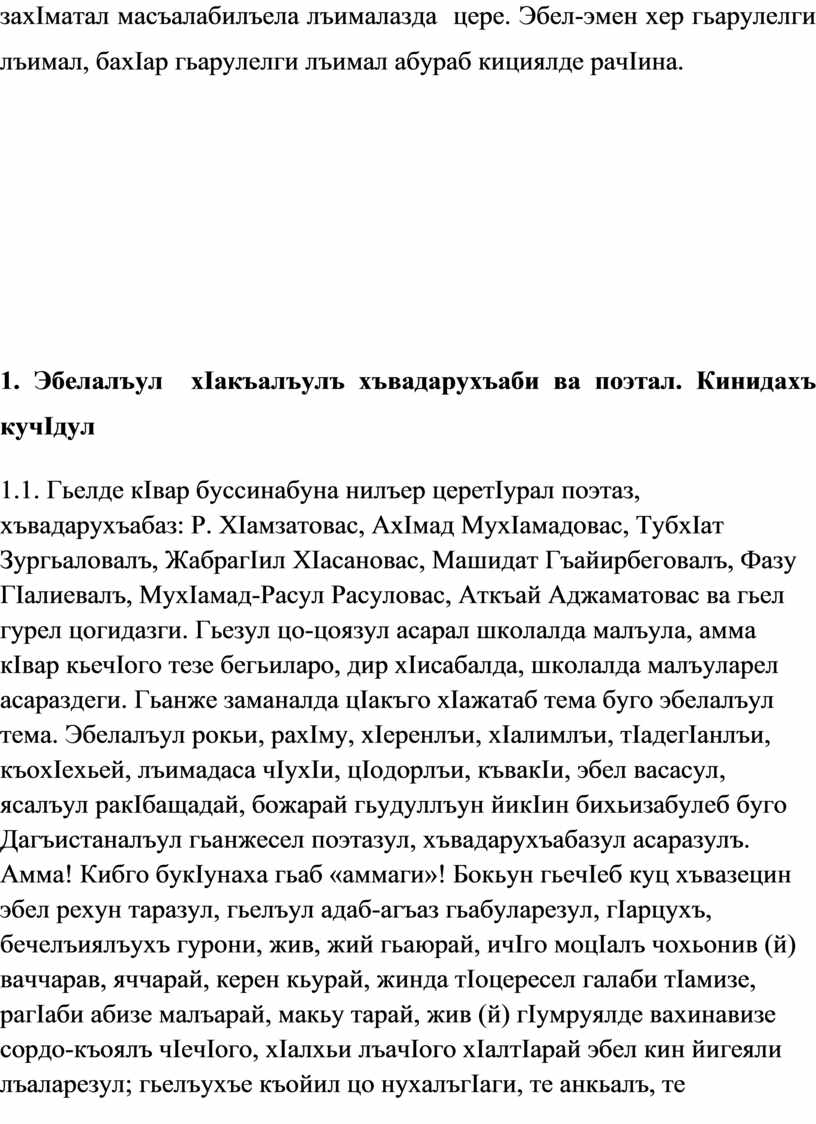 1.1. Гьелде кIвар буссинабуна нилъер церетIурал поэтаз, хъвадарухъабаз: Р. ХIамзатовас, АхIмад МухIамадовас, ТубхIат Зургьаловалъ, ЖабрагIил ХIасановас, Машидат Гъайирбеговалъ, Фазу ГIалиевалъ, МухIамад-Расул Расуловас, Аткъай Аджаматовас ва гьел гурел цогидазги. Гьезул цо-цоязул асарал школалда малъула, амма кIвар кьечIого тезе бегьиларо, дир хIисабалда, школалда малъуларел асараздеги. Гьанже заманалда цIакъго хIажатаб тема буго эбелалъул тема. Эбелалъул рокьи, рахIму, хIеренлъи, хIалимлъи, тIадегIанлъи, къохIехьей, лъимадаса чIухIи, цIодорлъи, къвакIи, эбел васасул, ясалъул ракIбащадай, божарай гьудуллъун йикIин бихьизабулеб буго Дагъистаналъул гьанжесел поэтазул, хъвадарухъабазул асаразулъ. Амма! Кибго букIунаха гьаб «аммаги»! Бокьун гьечIеб куц хъвазецин эбел рехун таразул, гьелъул адаб-агъаз гьабуларезул, гIарцухъ, бечелъиялъухъ гурони, жив, жий гьаюрай, ичIго моцIалъ чохьонив (й) ваччарав, яччарай, керен кьурай, жинда тIоцересел галаби тIамизе, рагIаби абизе малъарай, макьу тарай, жив (й) гIумруялде вахинавизе сордо-къоялъ чIечIого, хIалхьи лъачIого хIалтIарай эбел кин йигеяли лъаларезул; гьелъухъе къойил цо нухалъгIаги, те анкьалъ, те КIалбиччанкъоялъгIаги, цо нухалъгIаги ахIун бачIунарезул хъвазе ккелаха, ругелъул гьединал нилъеда гьоркьор.