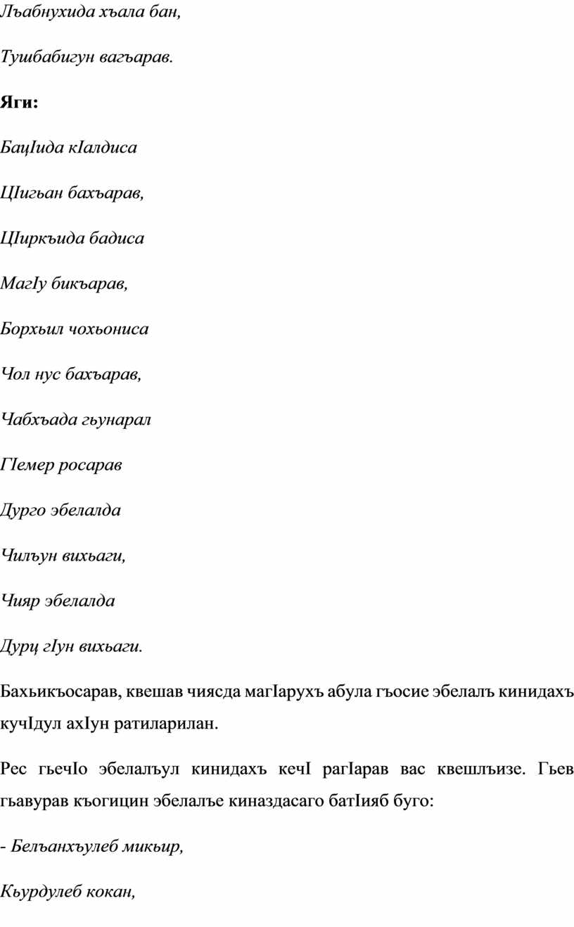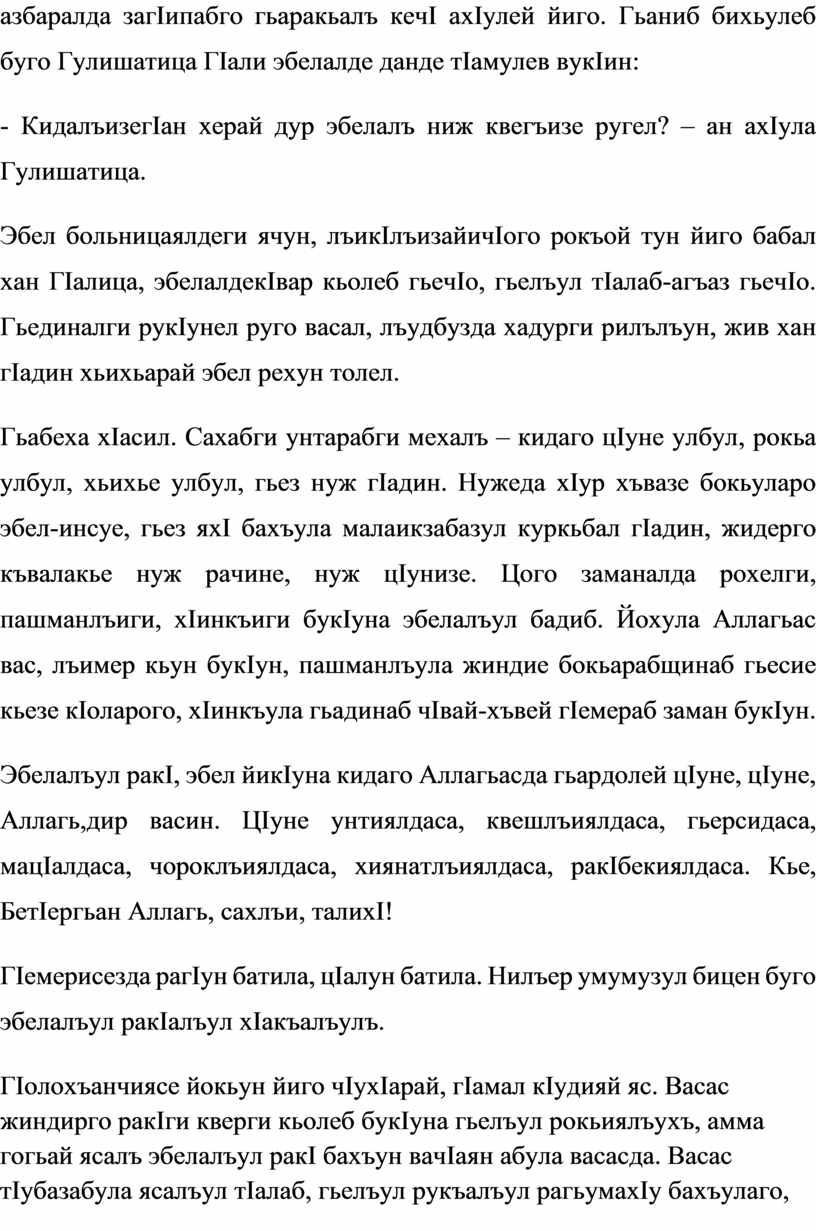 Дирги гьечIо эбел. Гьей хваралдаса нахъе дир къо релълъуна чирахъ свараб рукъалда. Эбел йигеб мехалда гIадаб рекIел тирхиги, гьурмал гьимиги гьанже дир букIунаро. Гьеб букIана унго-унгояб талихIаб заман. Гьединлъидал цIуне эбел!»